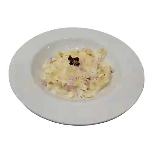 Pasta, crema, mantequilla, tocino y queso parmesano.