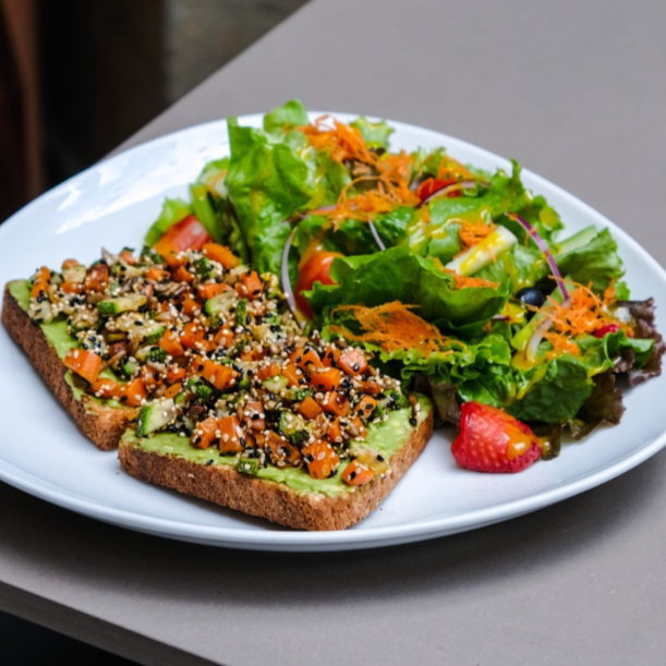 Pan integral, aguacate, verduras salteadas calabaza bola, zanahoria, aceite de ajonjolí, semillas y ensalada verde.