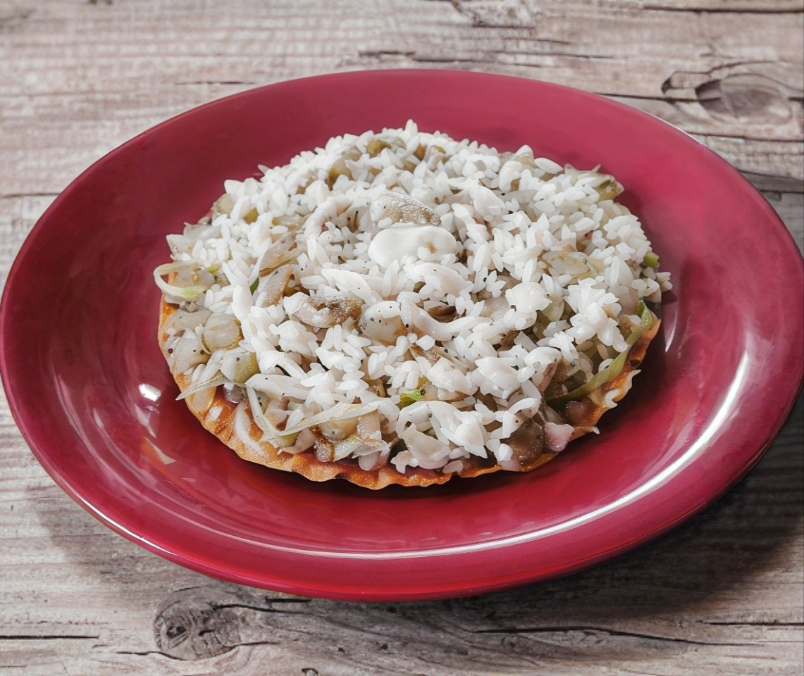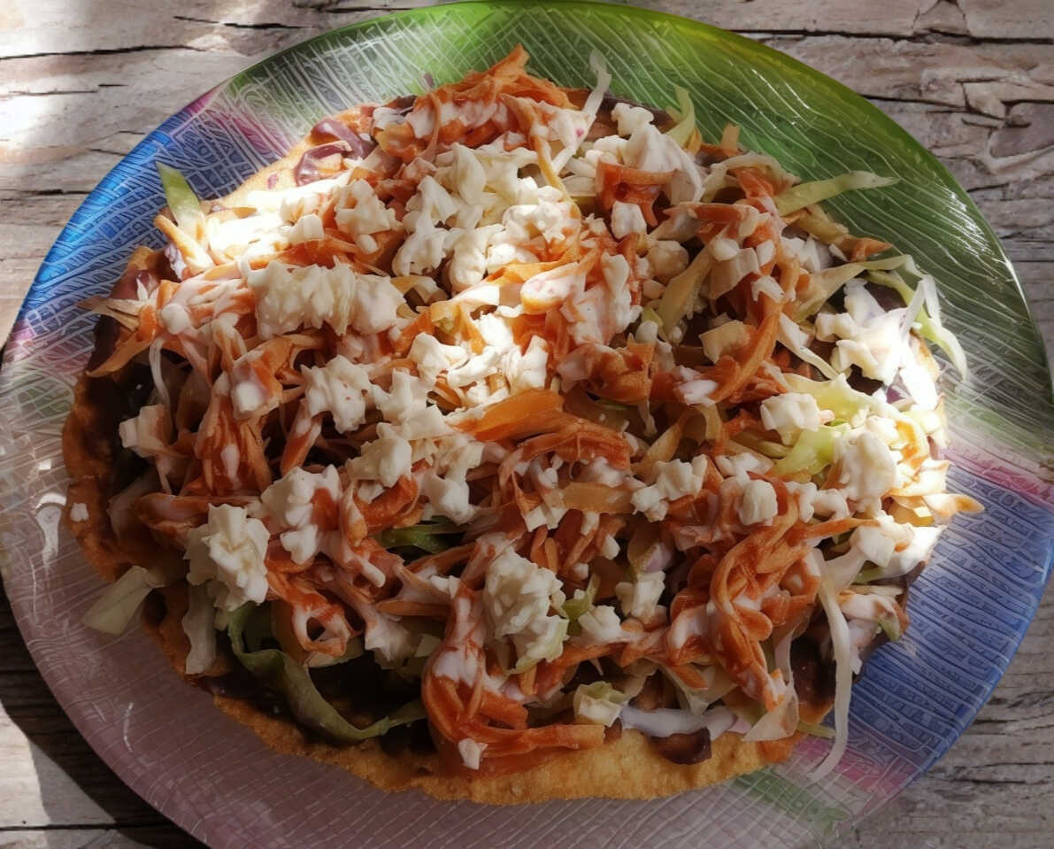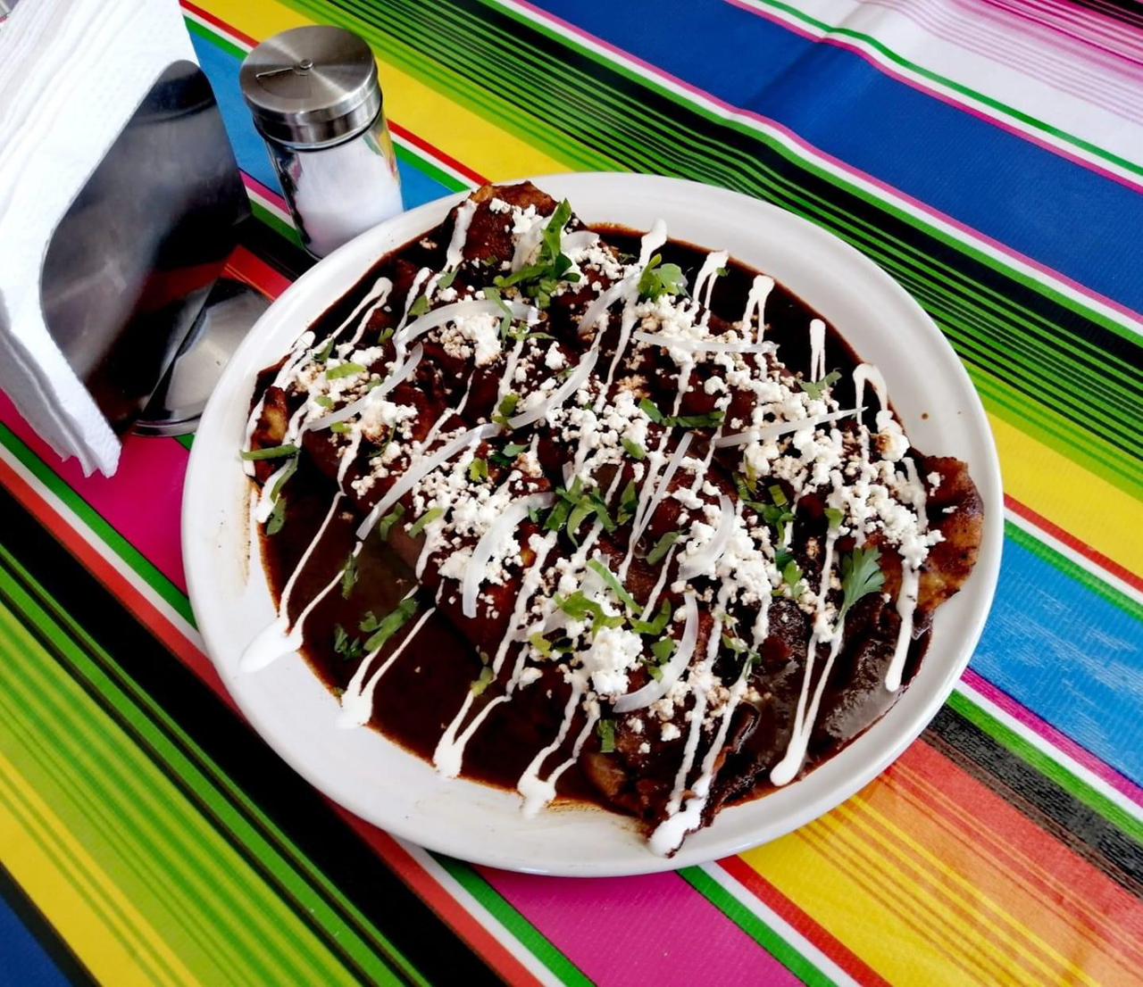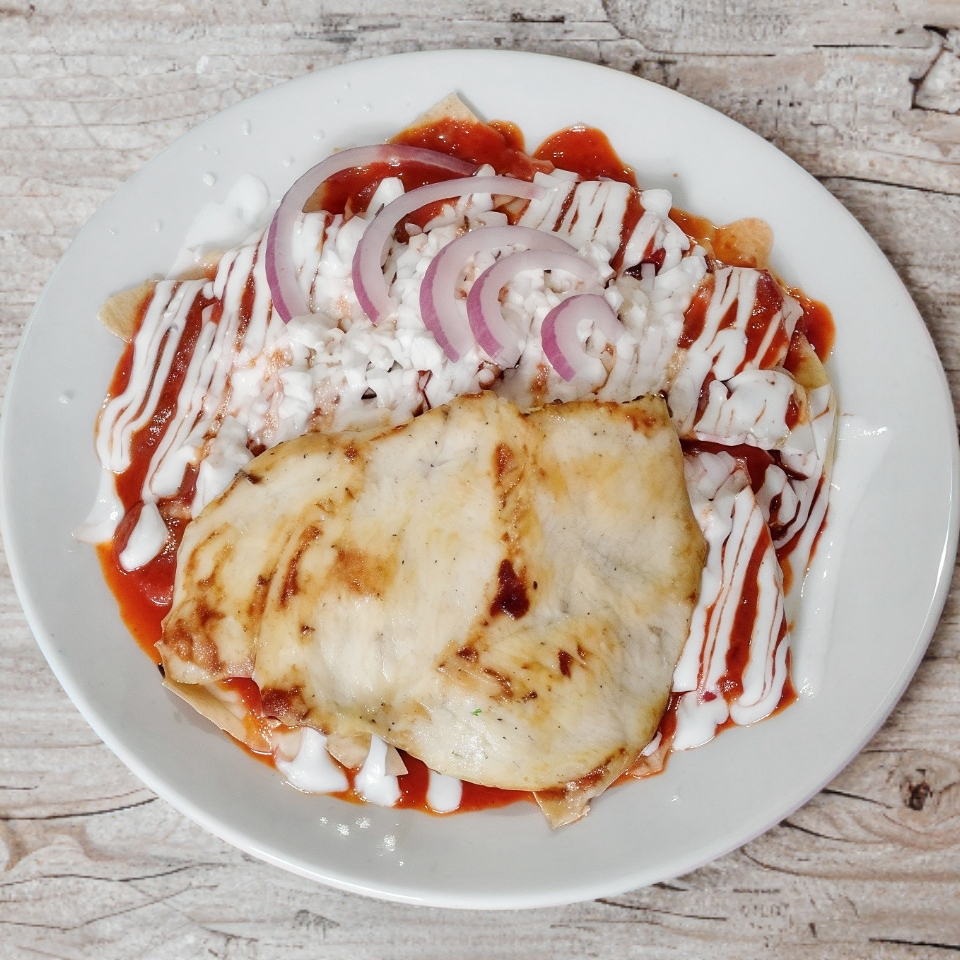 Deliciosa tortilla frita bañada en salsa de guajillo adornados de cebolla, queso y crema.