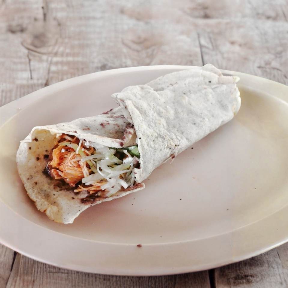deliciosa tortilla de mano rellenas de pollo bañadas en un coloradito casero