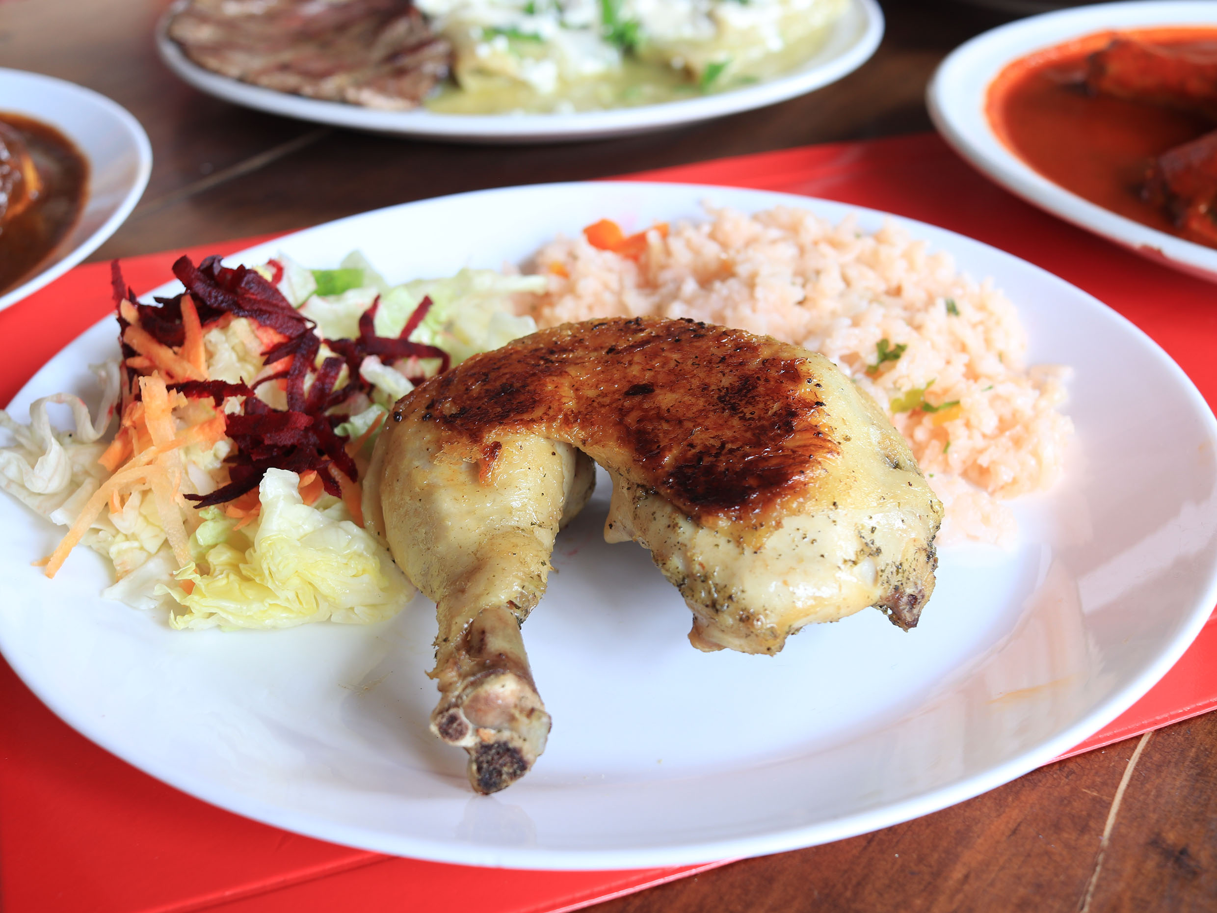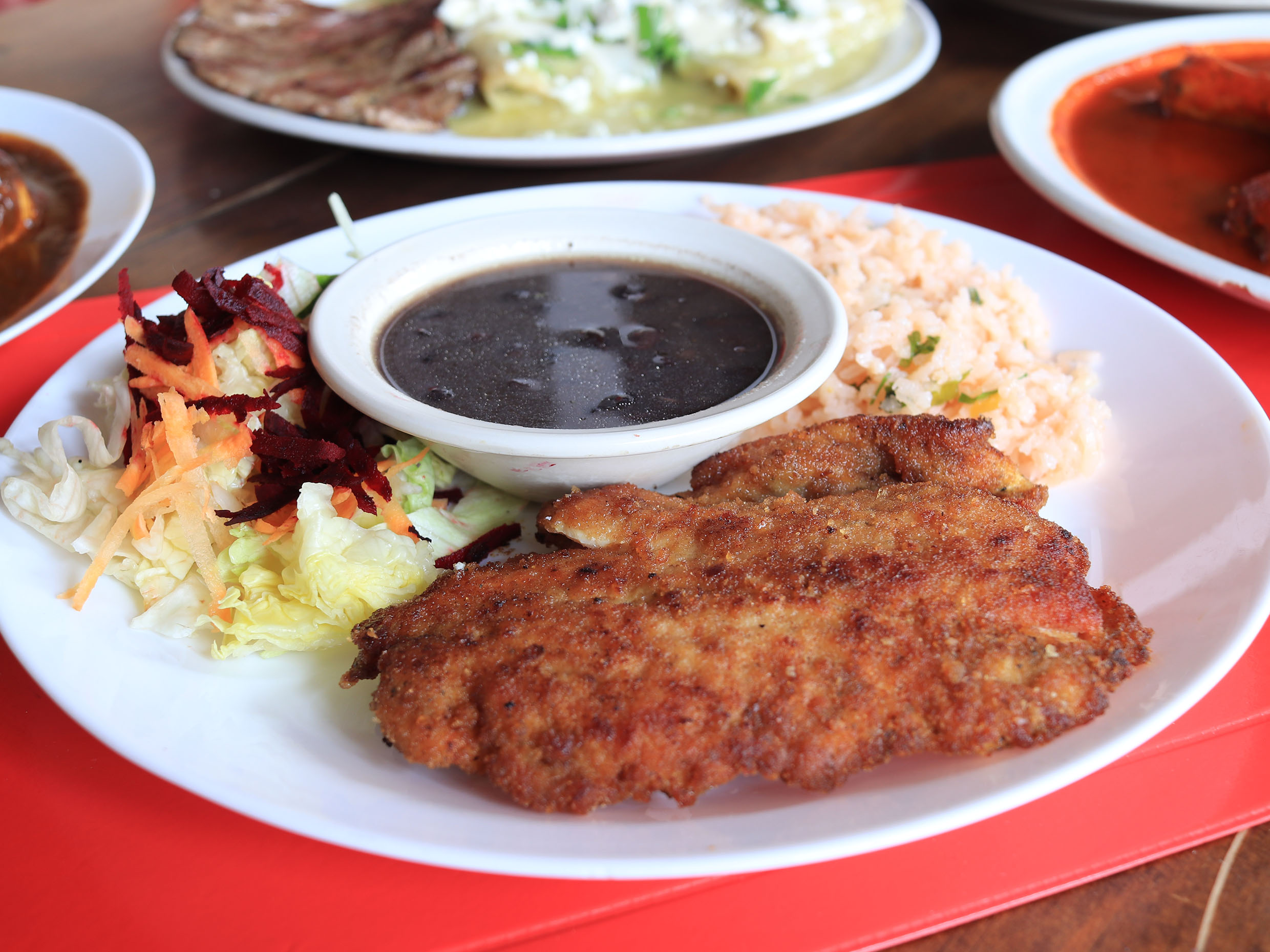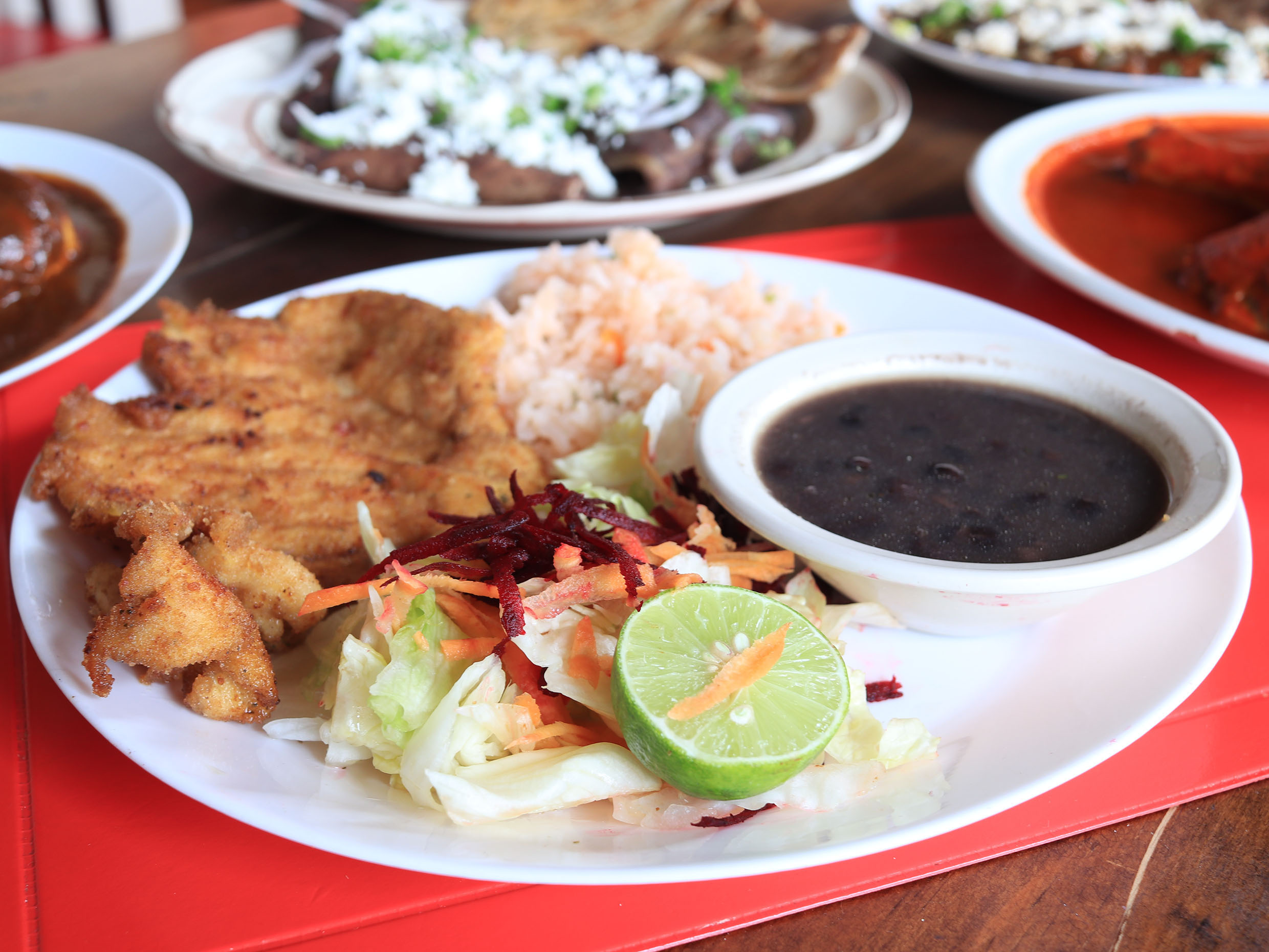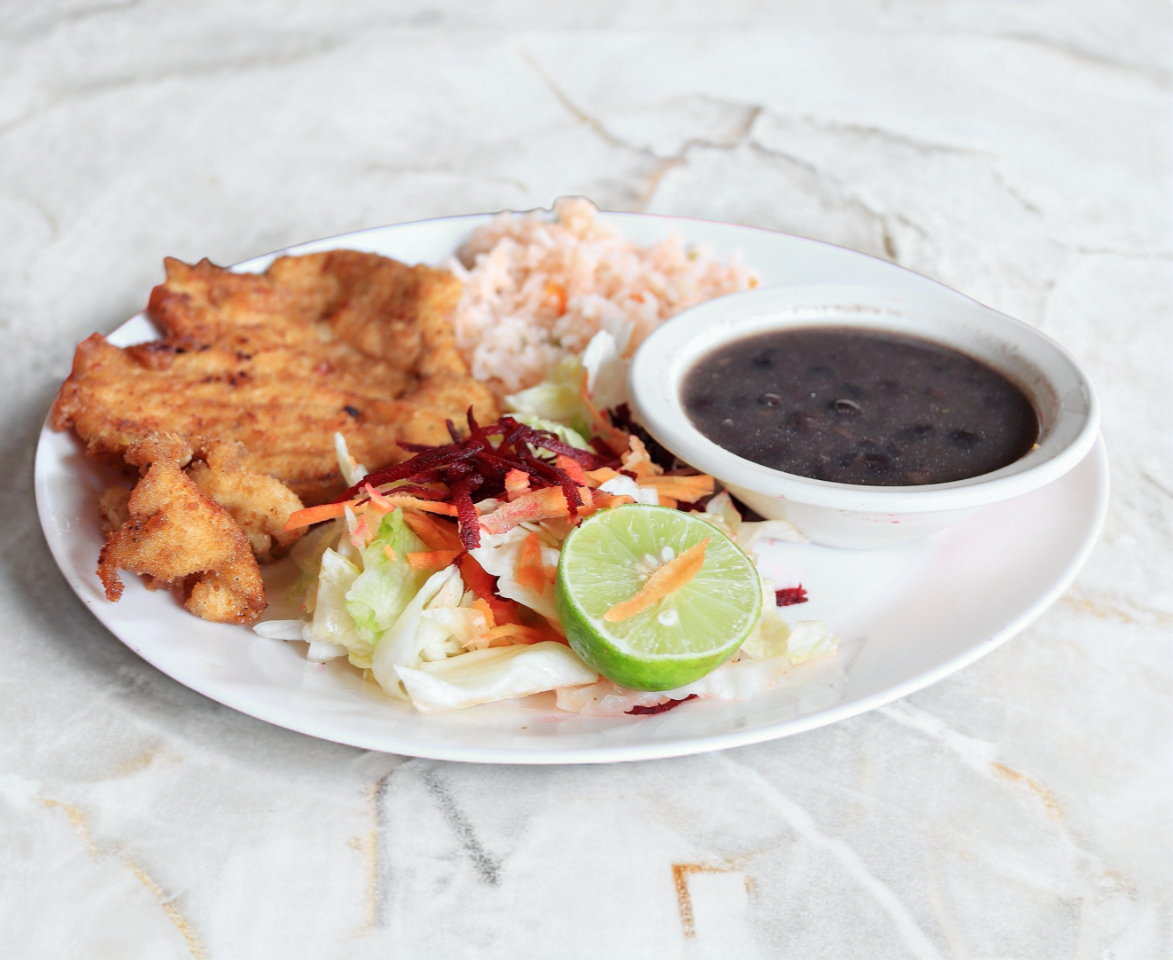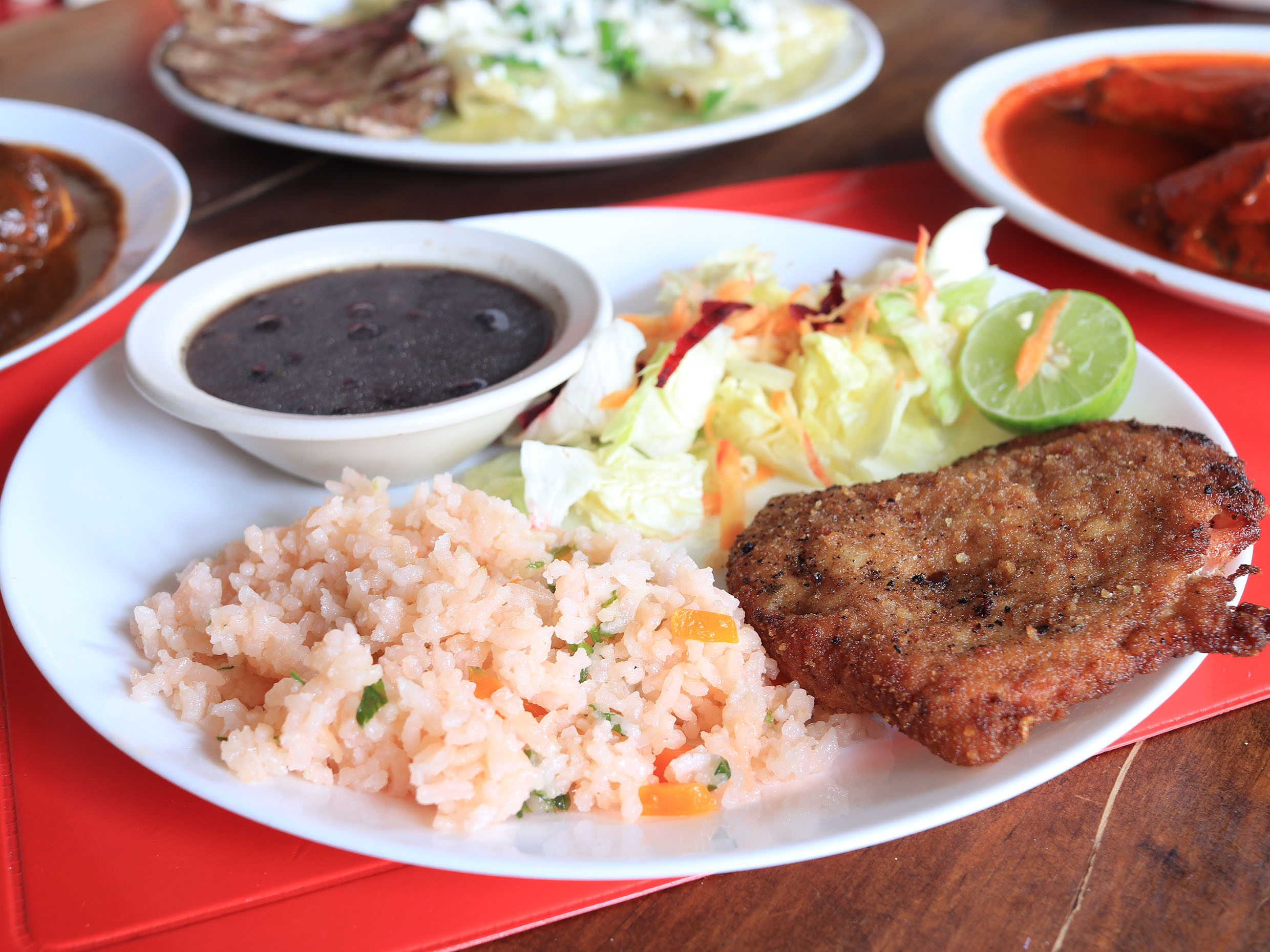 acompañado de arroz, ensalada, frijol, salsa, tortilla de mano y agua de sabor