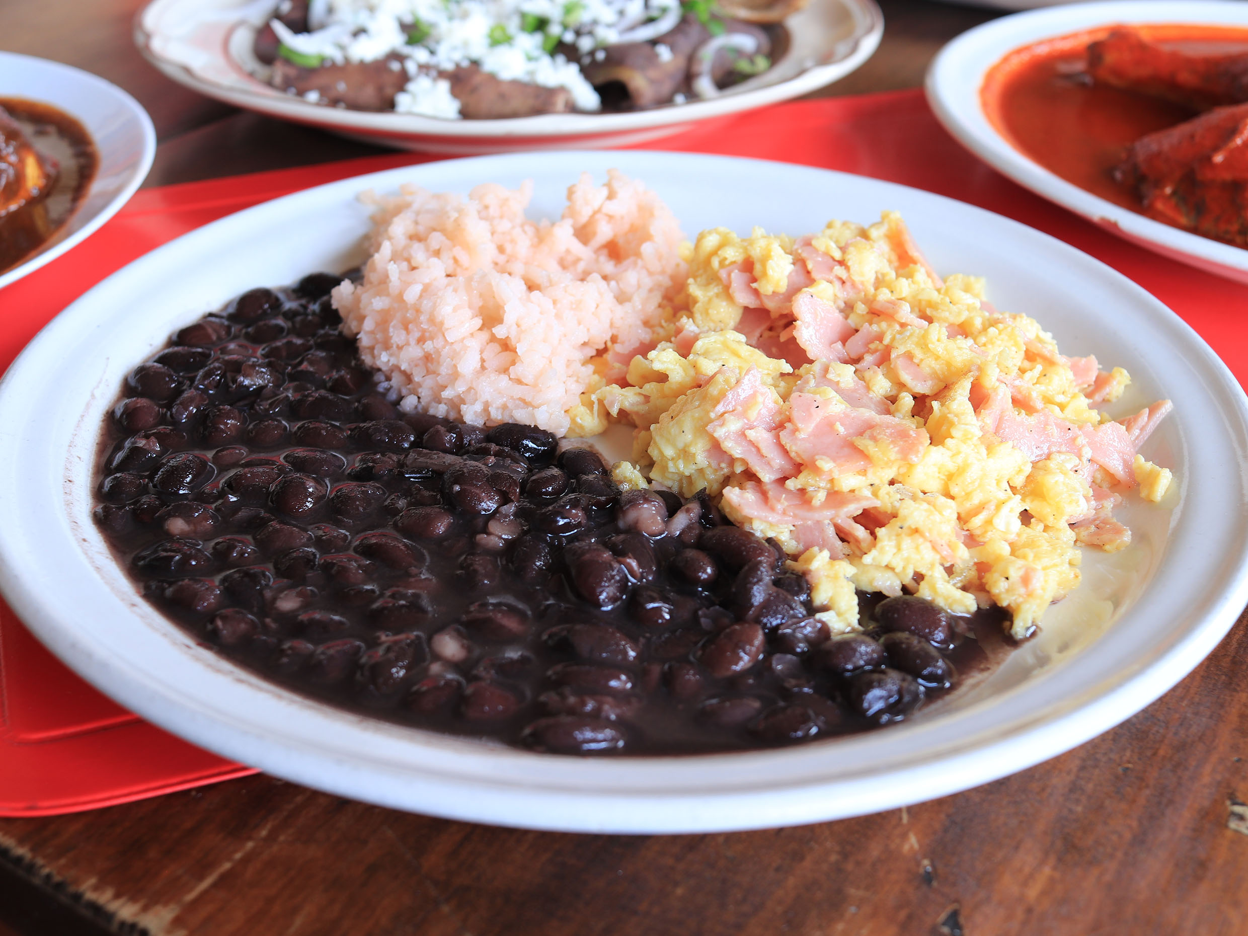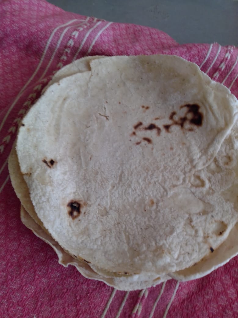 Tres tortillas bañadas con frijol, queso, perejil, cebolla, bolillo, agua de sabor