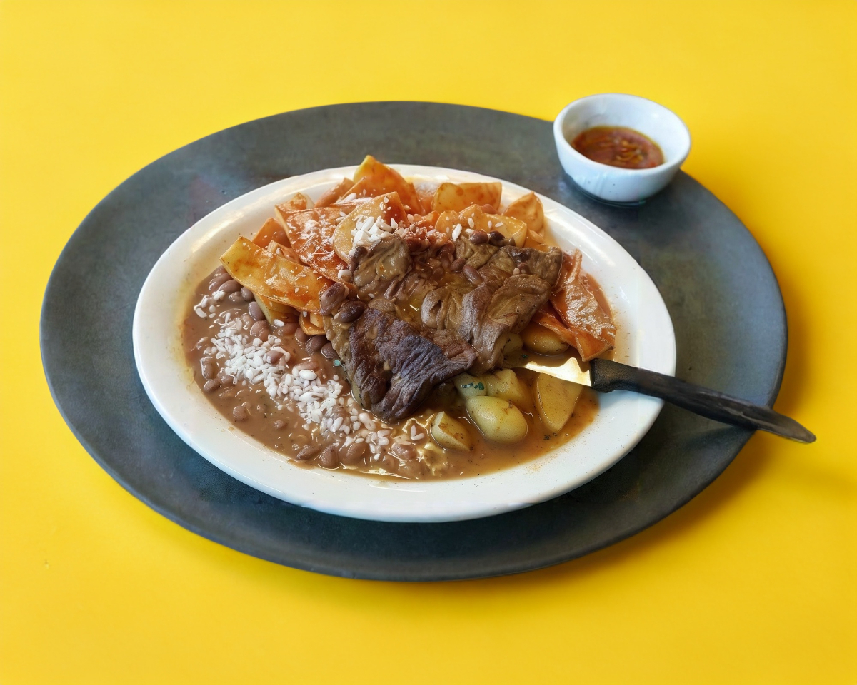 1 Porción personal de chilaquiles con tasajo incluye totopos de maíz 1 bolillo y salsa a elegir, queso fresco, crema, cebolla y perejil.