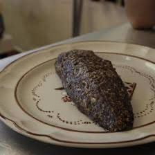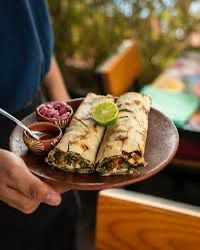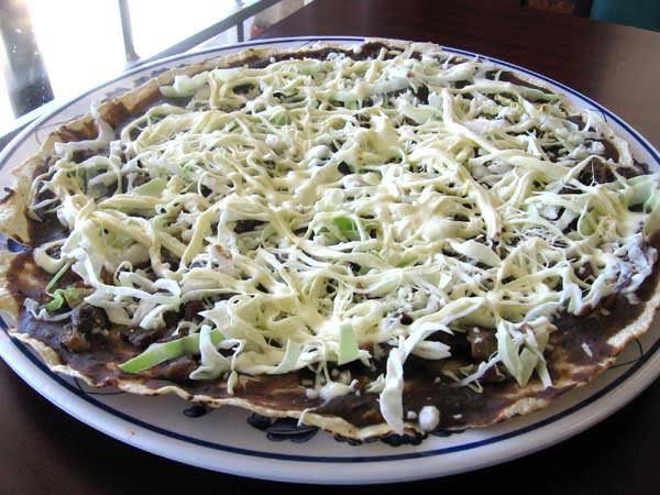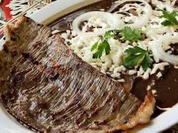 Tortillas rellenas bañadas en mole, servidas con tasajo.