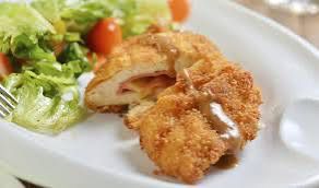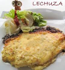 Pechuga gratinada con ensalada y arroz o frijoles.