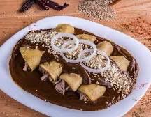 Tortillas rellenas bañadas en mole, rellenas de pollo.