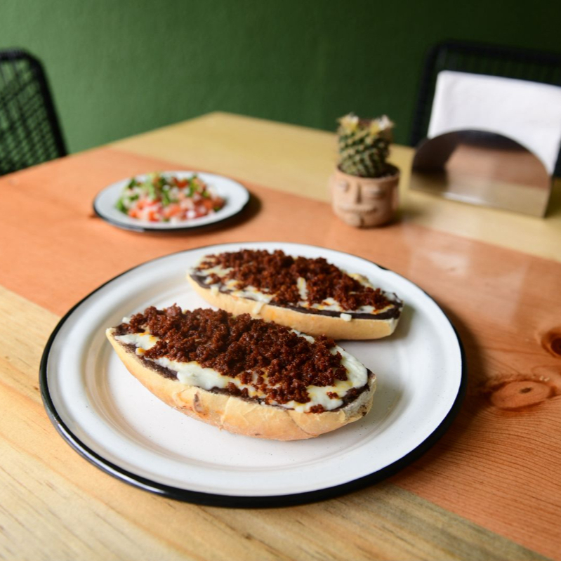 Bolillo, queso mozzarella, choriz, acompañado de pico de gallo.