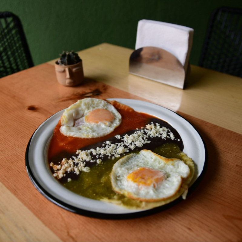 Tres tortillas fritas bañadas en salsa de tomate, con queso fresco, cebolla, crema y perejil.