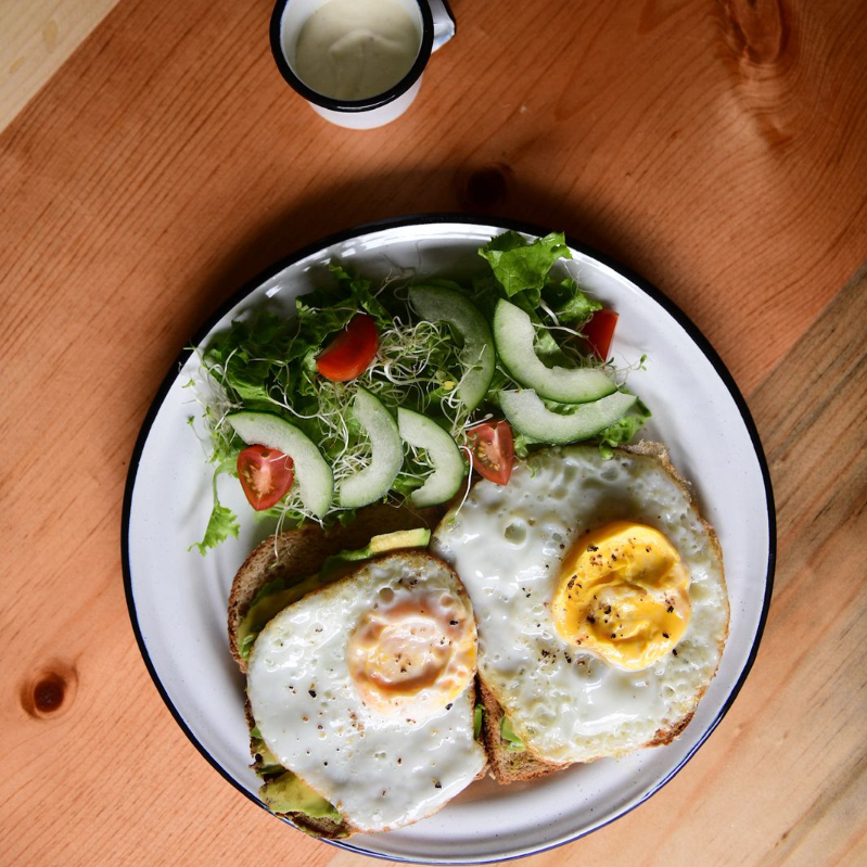2 Rebanadas de pan de caja, aguacate, 2 huevos estrellados, acompañados de ensalada y aderezo o aceite de oliva.