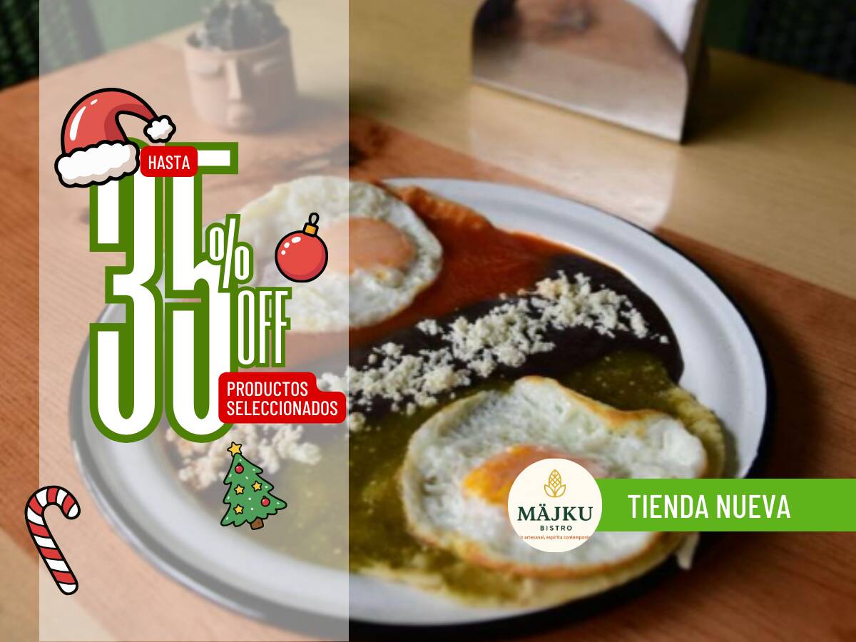 2 Huevos estrellados en tortilla frita bañados en salsa roja y verde, acompañados de frijoles.