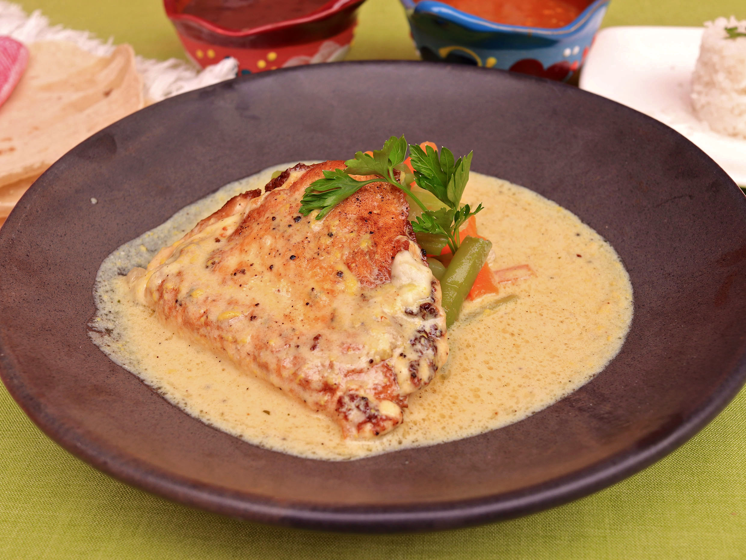 Sabrosa pechuga rellena. Bañada en salsa sabor mostaza.