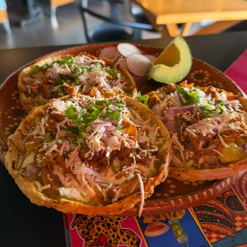 Tres piezas bañadas en salsa picosita de tomate con pollo. lechuga, crema, queso, tomate, rábano y aguacate.