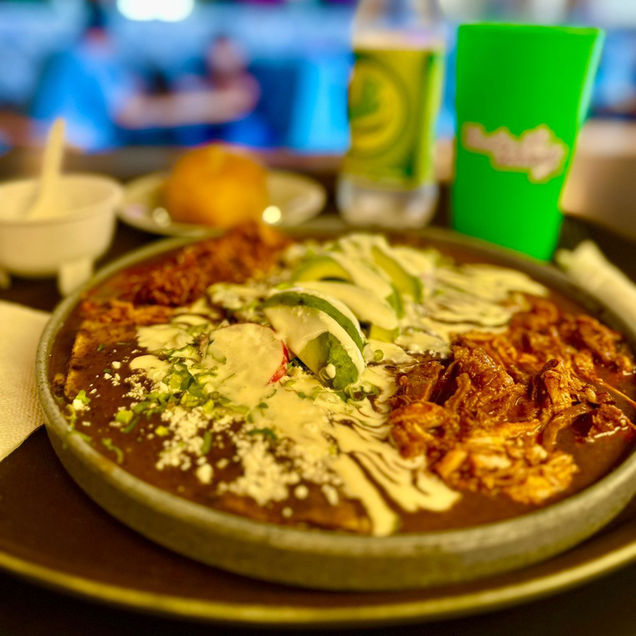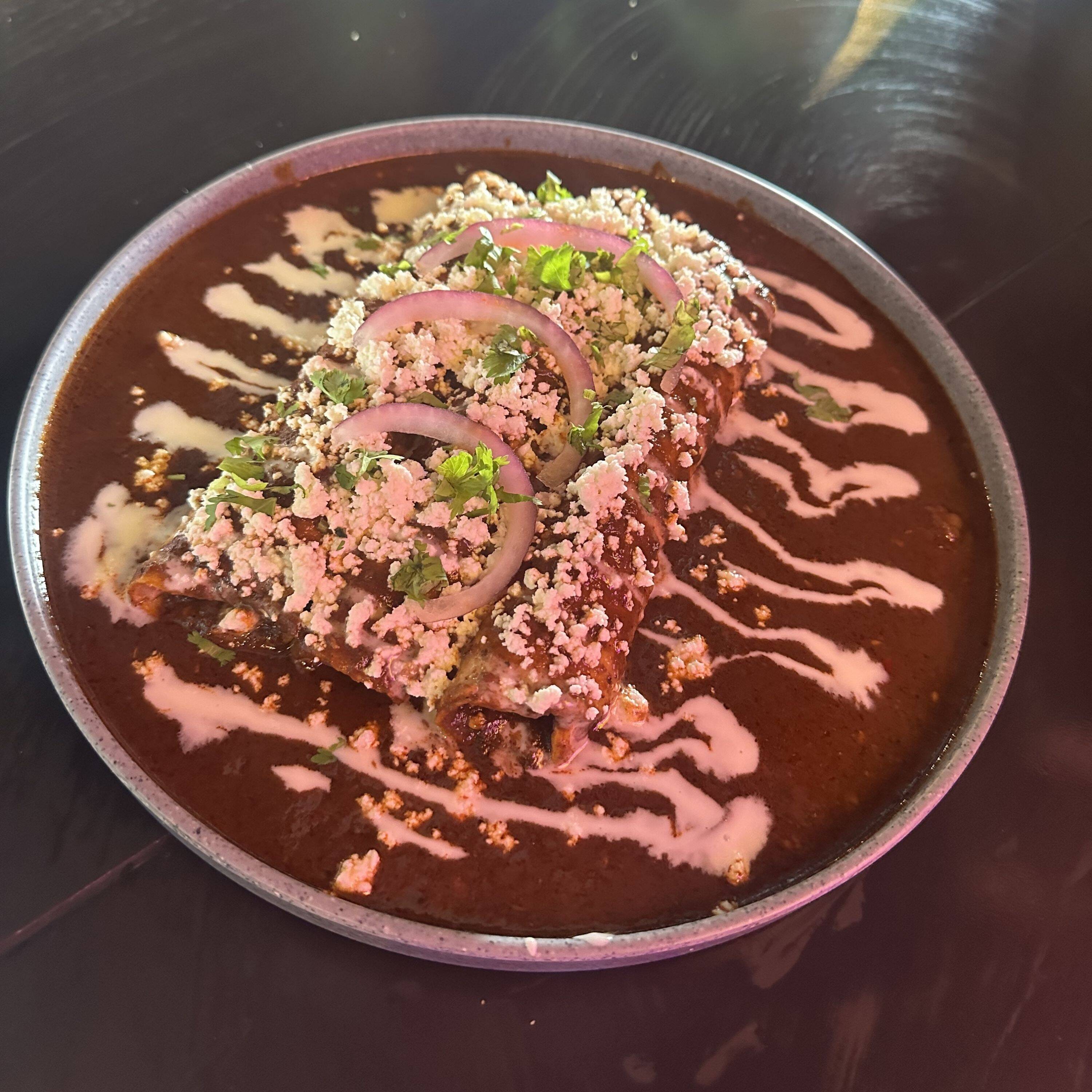 Tres enchiladas con mole costeño rellenas de pollo, encima crema, queso, cilantro y cebolla.