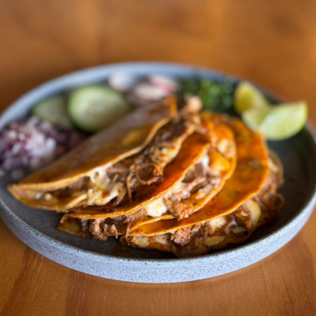 Tres piezas quesabirria de res acompañado de cilantro, cebolla, limón y pepino: incluye consomé chico.