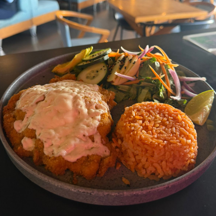 Milanesa de pollo gratinada, acompañada de arroz y ensalada.