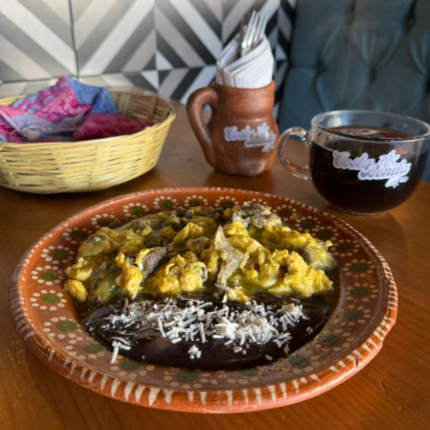 Mezcla de huevo con carne en salsa verde o roja; acompañado de frijol y tortillas de maíz.