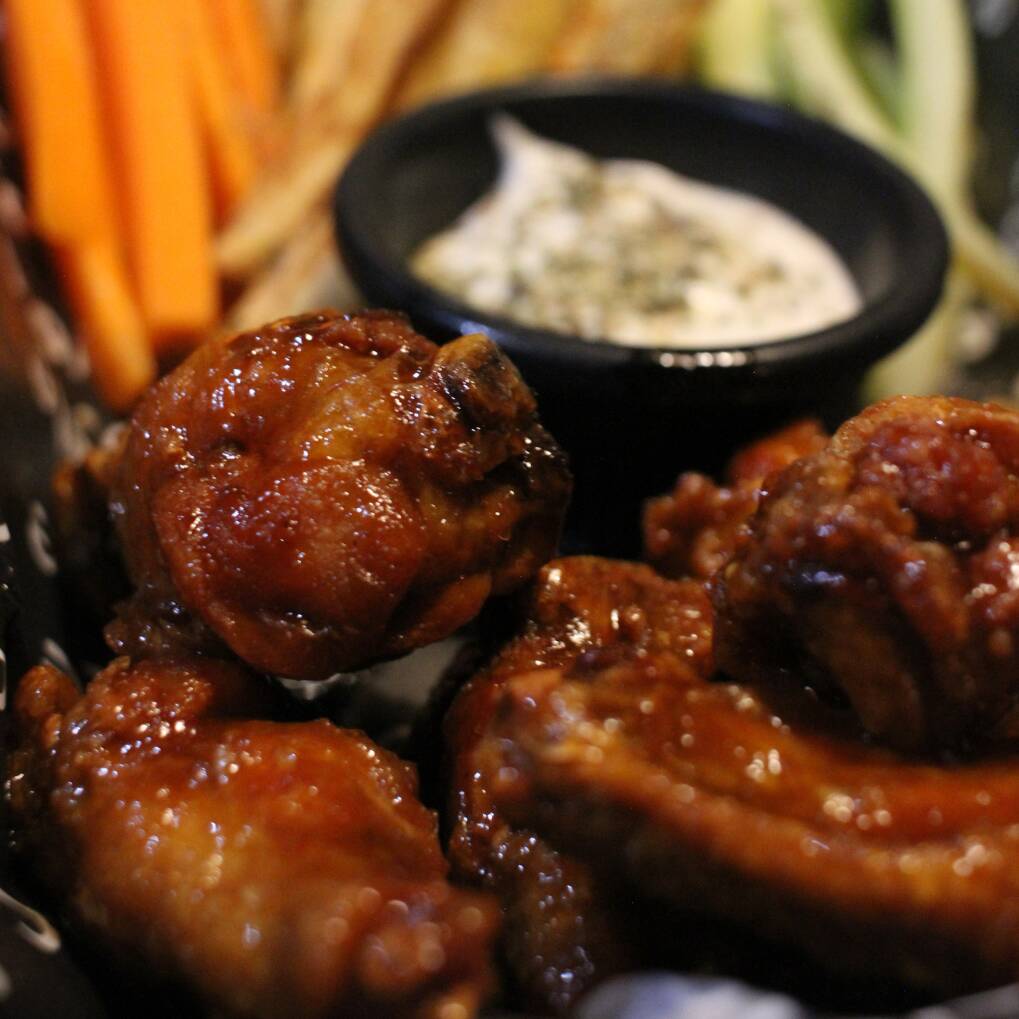 Alitas crunchy acompañadas de bastones de zanahoria, apio y ranch.