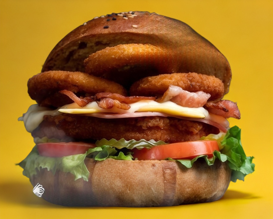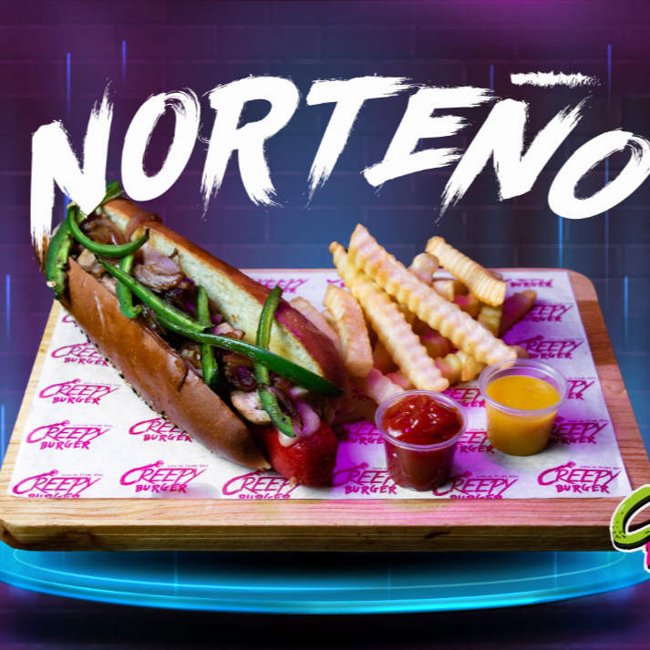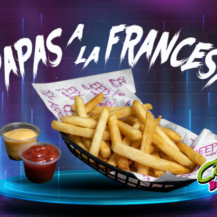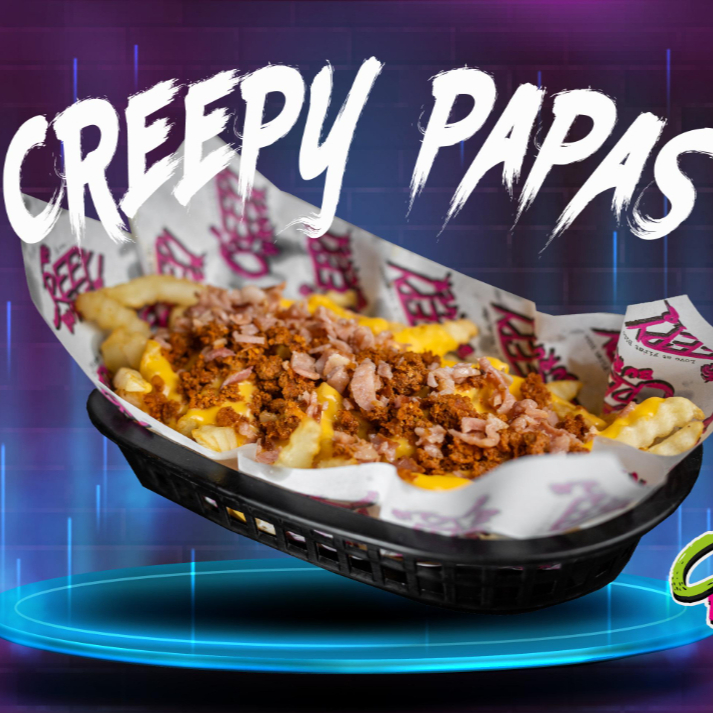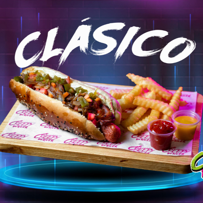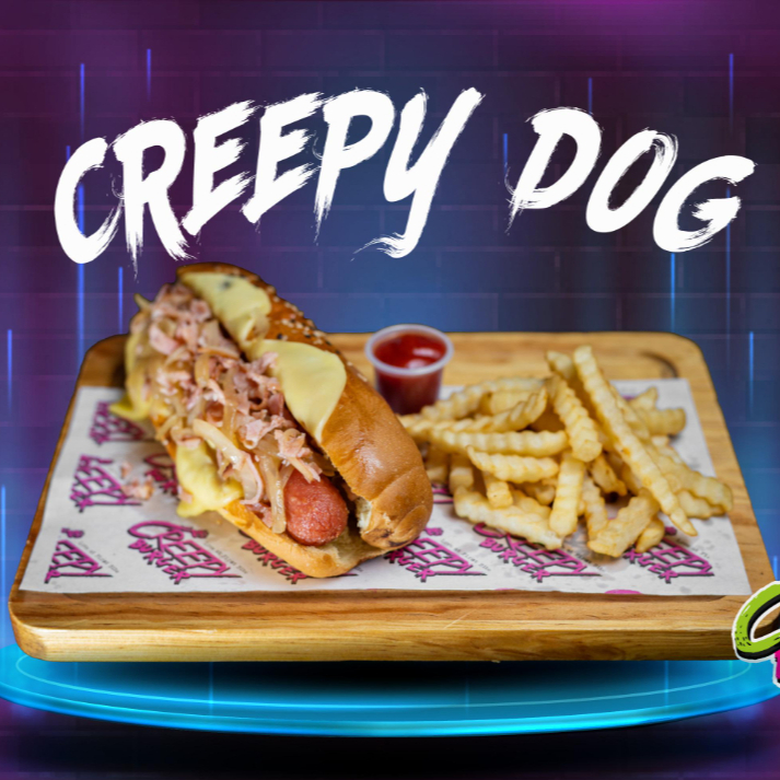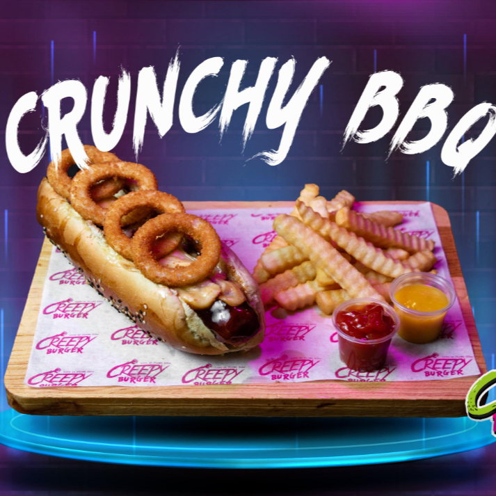 Pan artesanal, aderezo Creepy, pechuga de pollo crunchy, jamón, queso mozzarella, queso americano, tocino y aros de cebolla crujientes, acompañada de papas a la francesa.