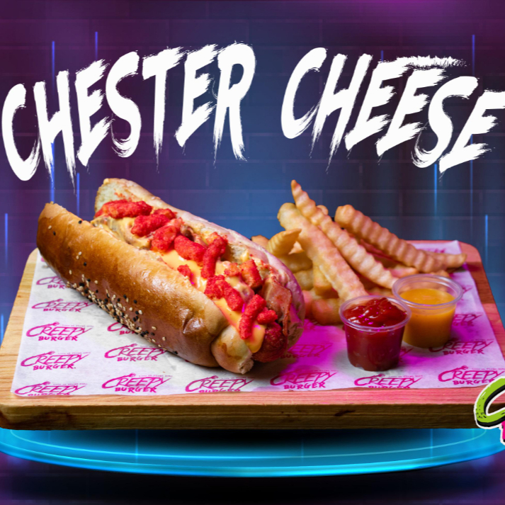 Pan artesanal, salchicha de pavo jumbo, queso cheddar, tocino y chetos flaming hot. GRATIS papitas a la francesa.
