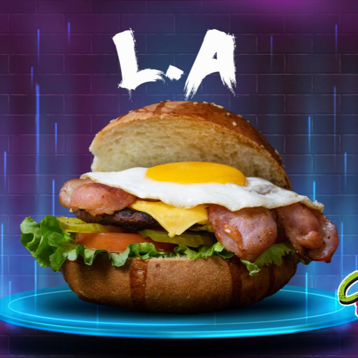 Pan artesanal, carne 100% de res, doble queso americano, tocino y huevo estrellado, acompañada de papas a la francesa.
