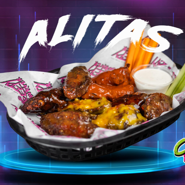 Pan artesanal, boneless bañados en la salsa de tu elección, queso manchego y tocino, acompañada de papas a la francesa.