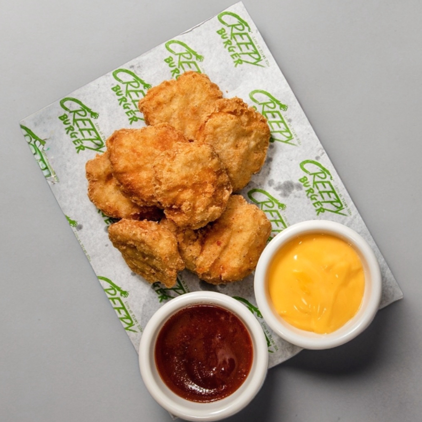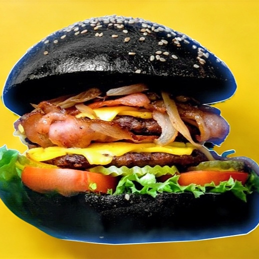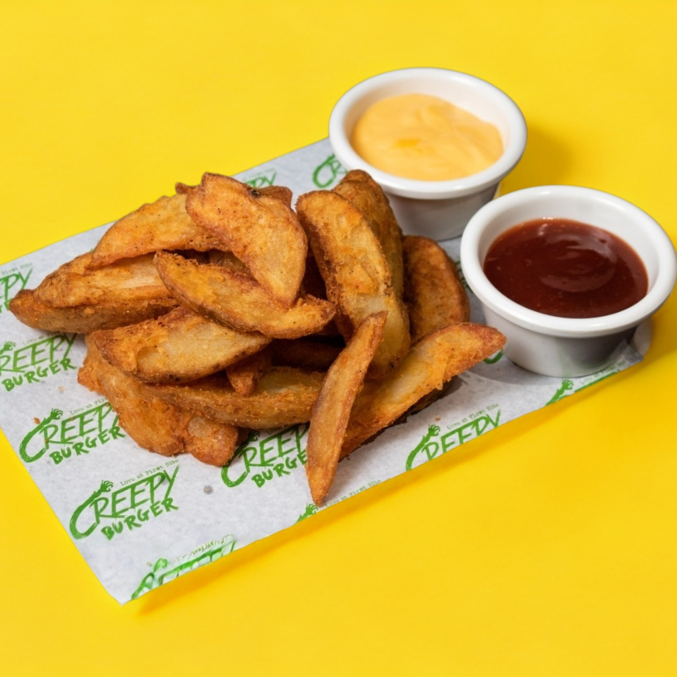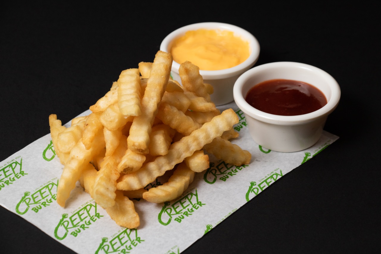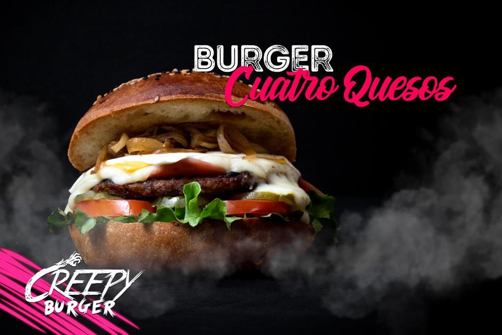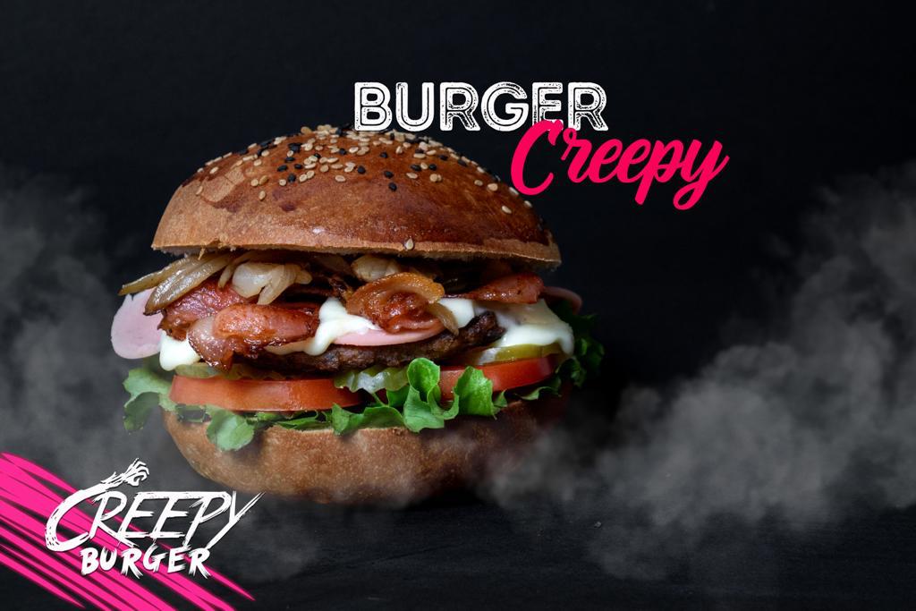 Pan artesanal negro, aderezo creepy, doble carne 100% de res, doble queso americano y doble tocino acompañada con papas a la francesa.