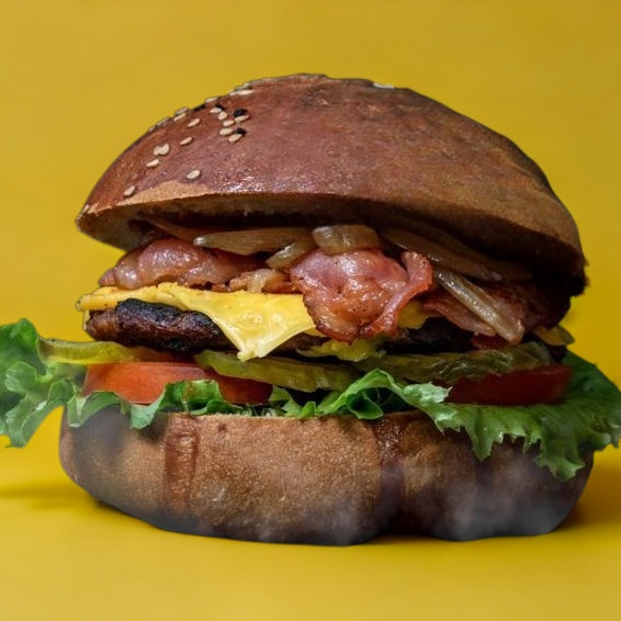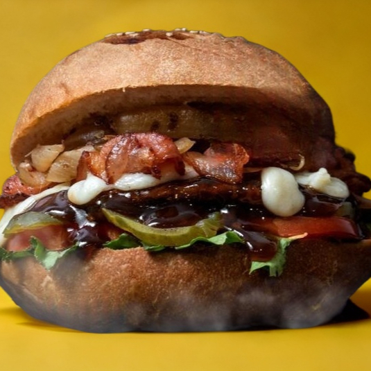 Pan artesanal, 100gr de carne 100% de res bañada en salsa BBQ, jamón, queso mozzarella, tocino, lechuga, pepinillo, cebolla y tomate. Acompañadas con una porción de papas a la francesa (aprox. 150 gr )y salsas
