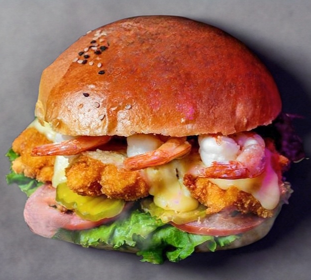 Pan artesanal, aderezo creepy, camarones crujientes y una costra de queso gouda.