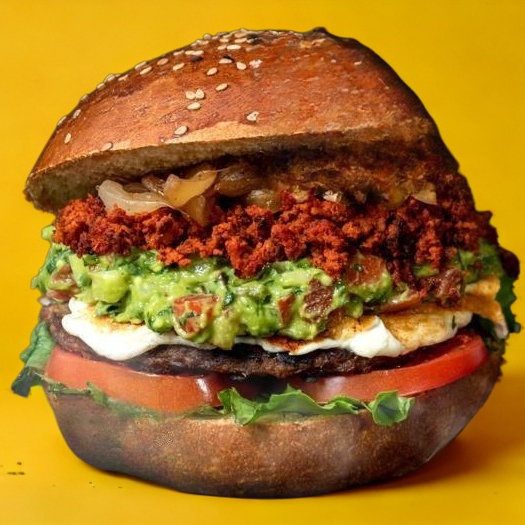 Pan artesanal, carne 100% de res, queso mozzarella, queso manchego, queso americano y queso crema. Acompañadas con papas a la francesa.