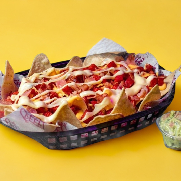 Totopos, queso cheddar, queso manchego, salchicha asadera, tocino y guacamole aparte.