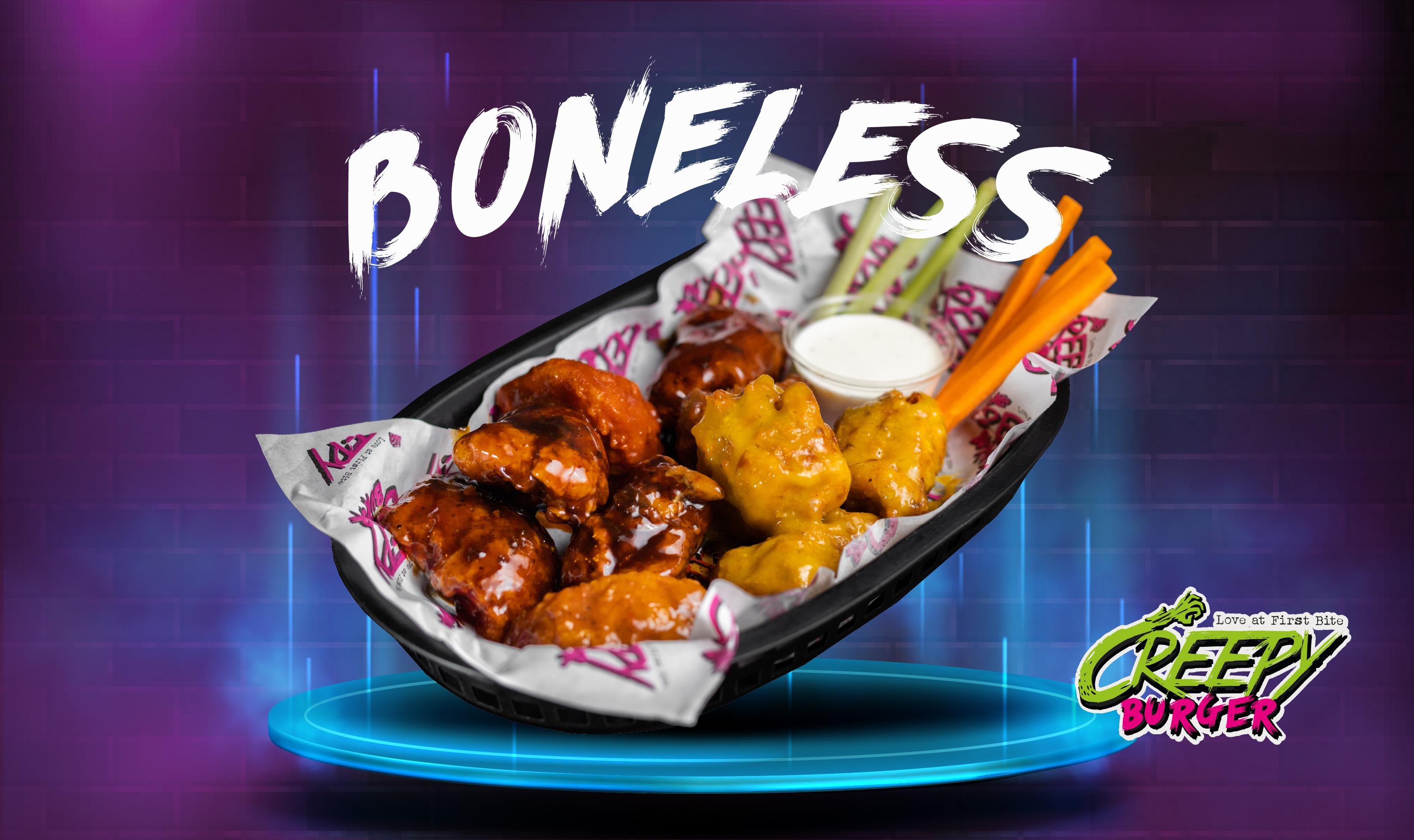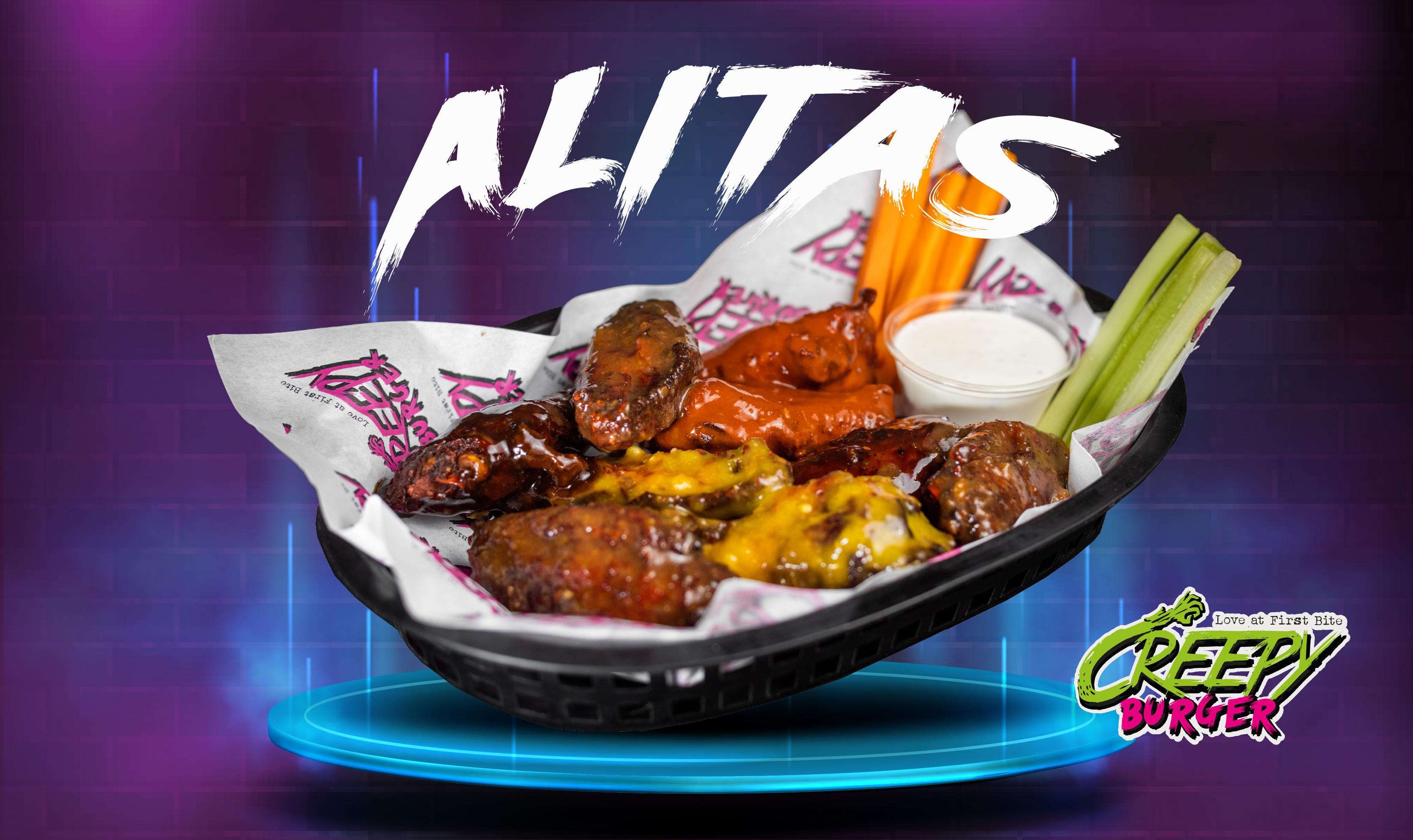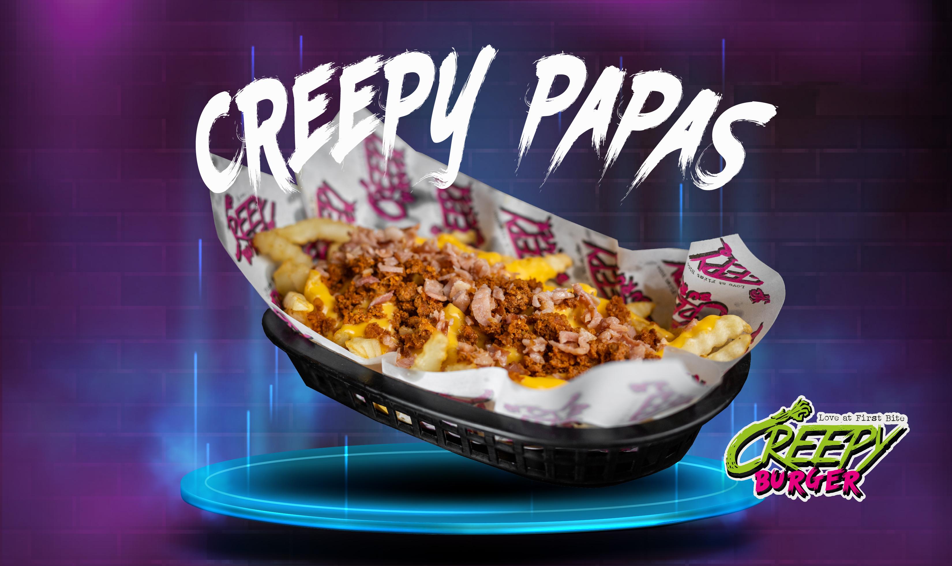 Pan artesanal negro, aderezo Creepy, doble carne 100% de res 120gr por carne, doble queso americano y doble tocino acompañada con papas a la francesa como porción adicional.