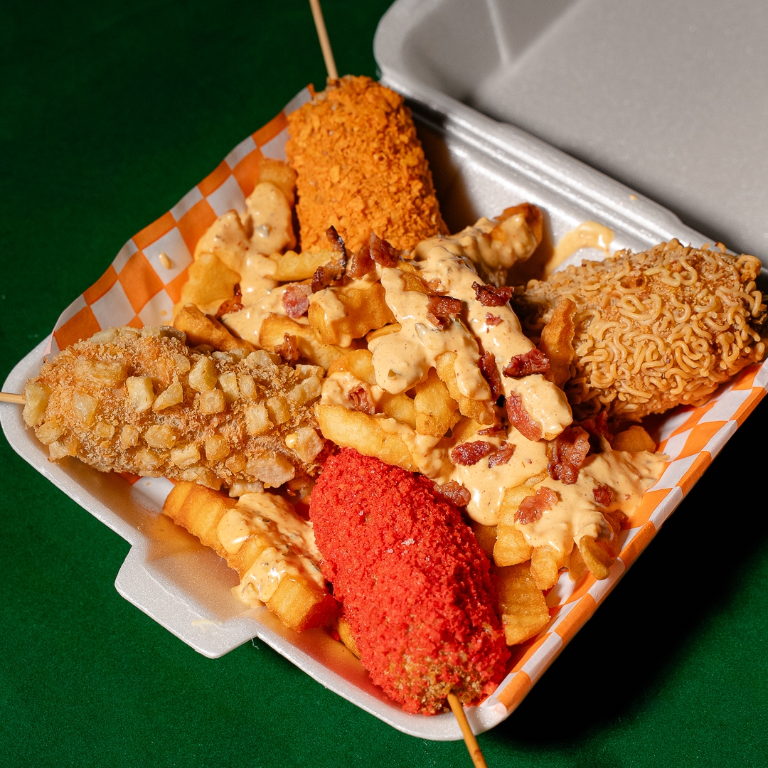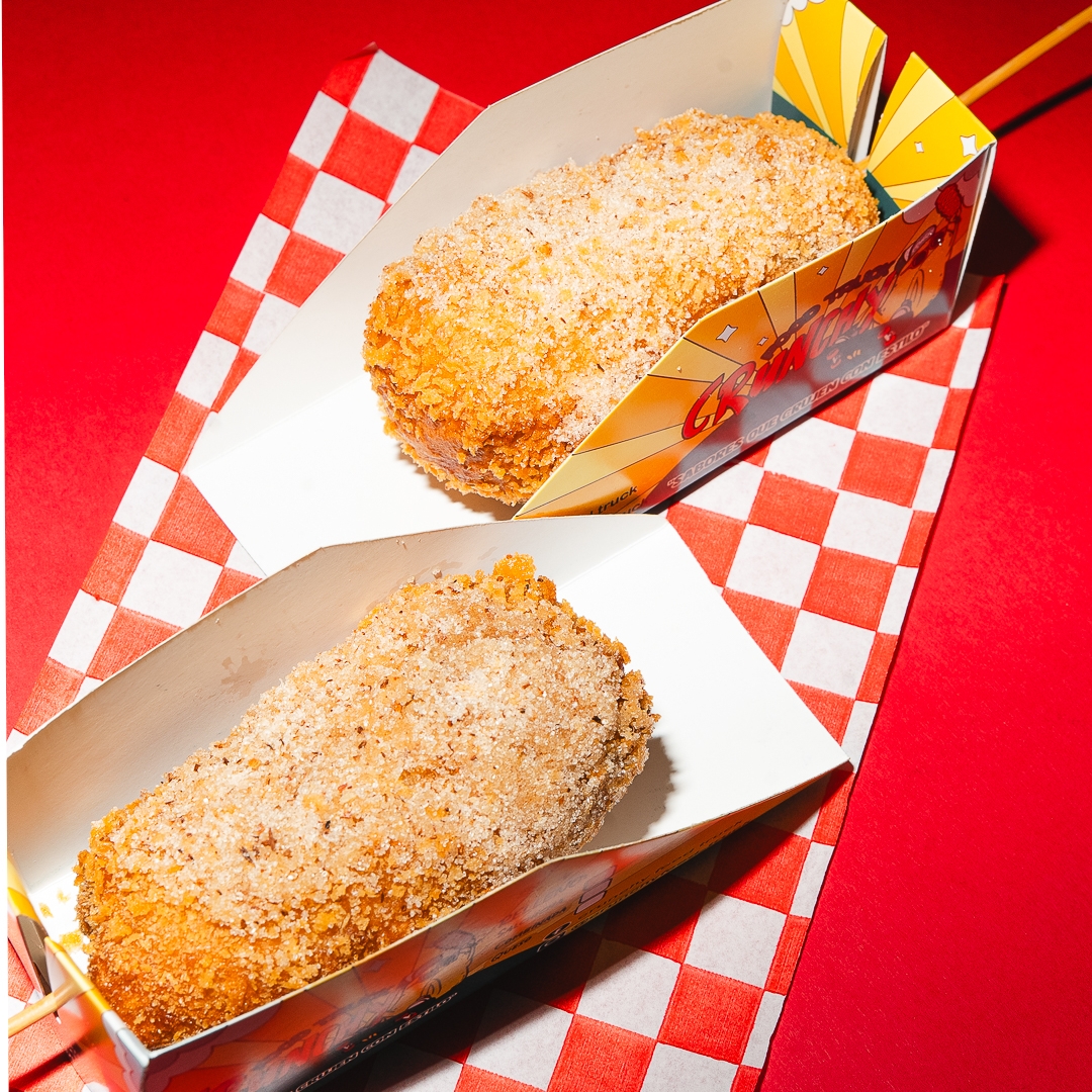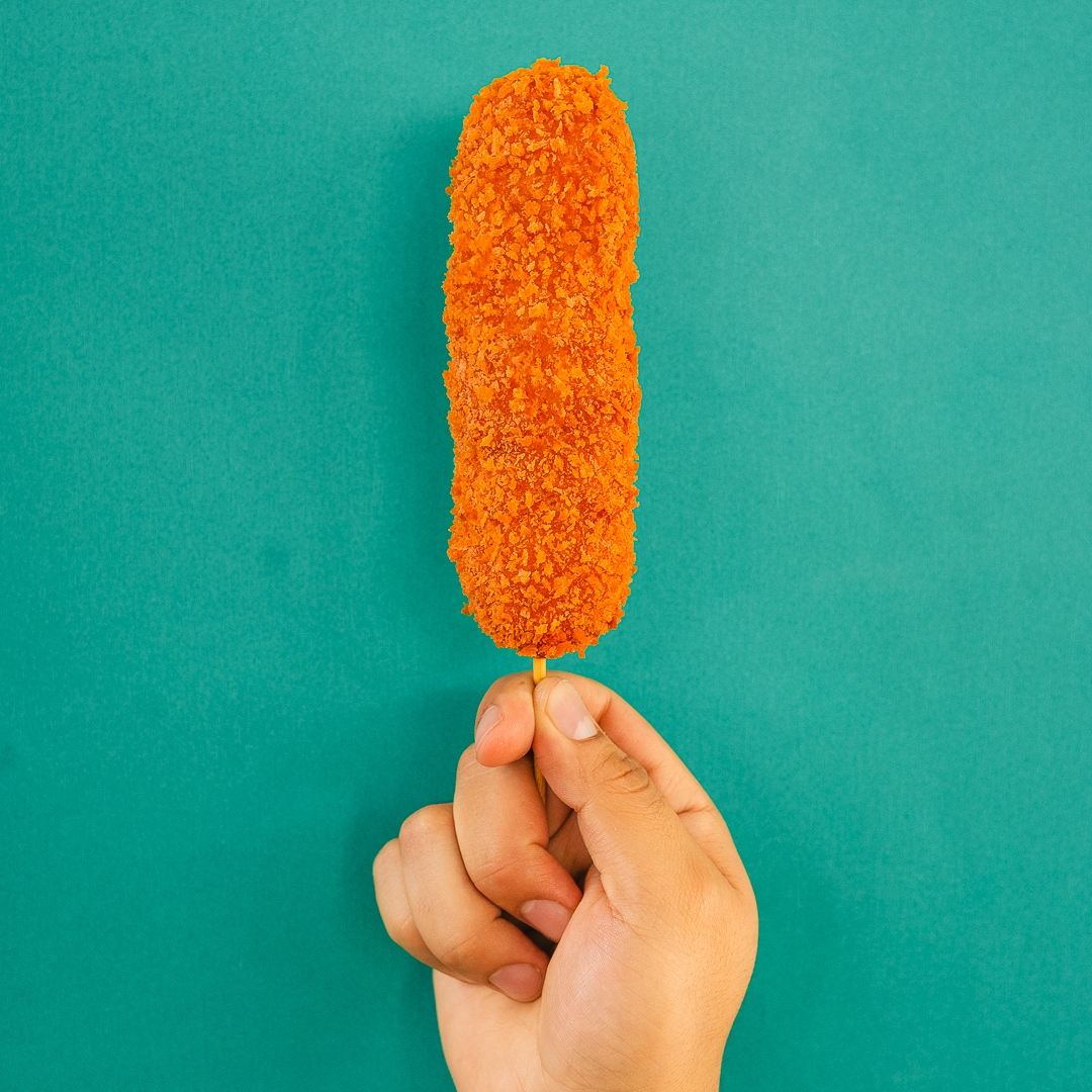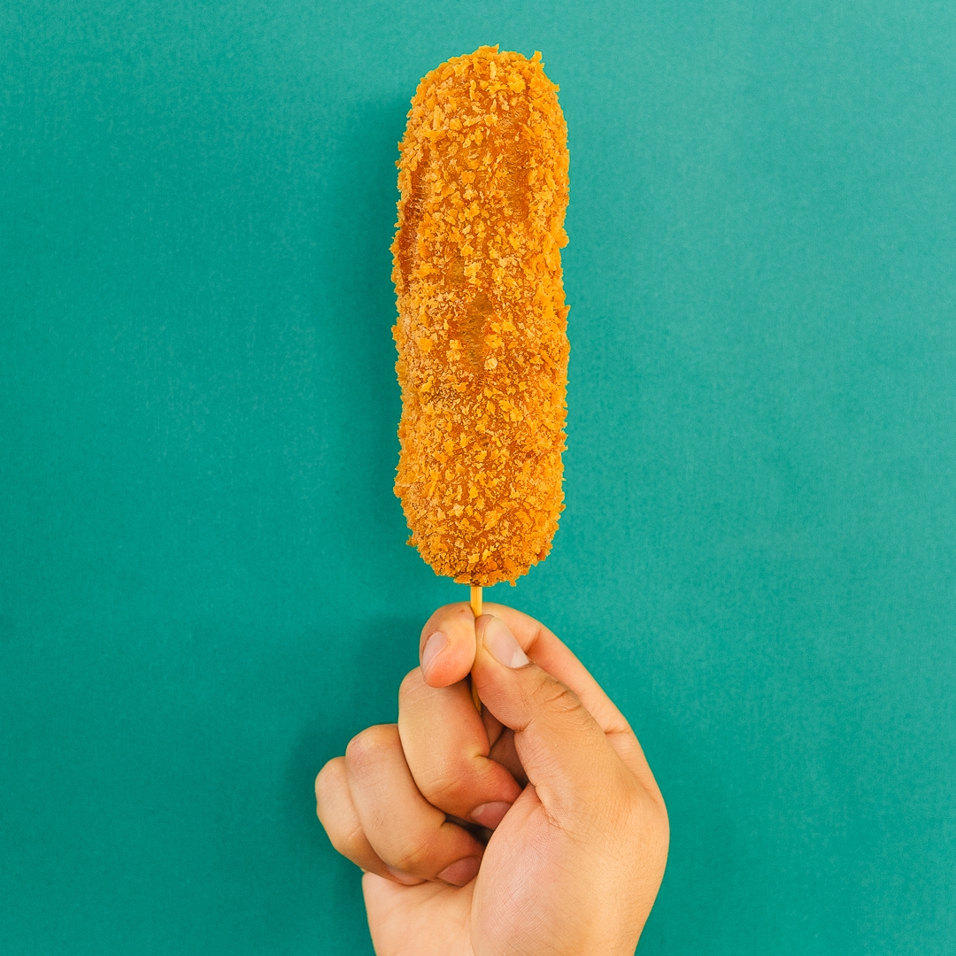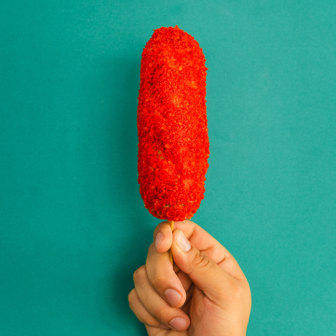 Preparada con masa, panko crujiente y cubierta de chetos flamin hot, frita al momento