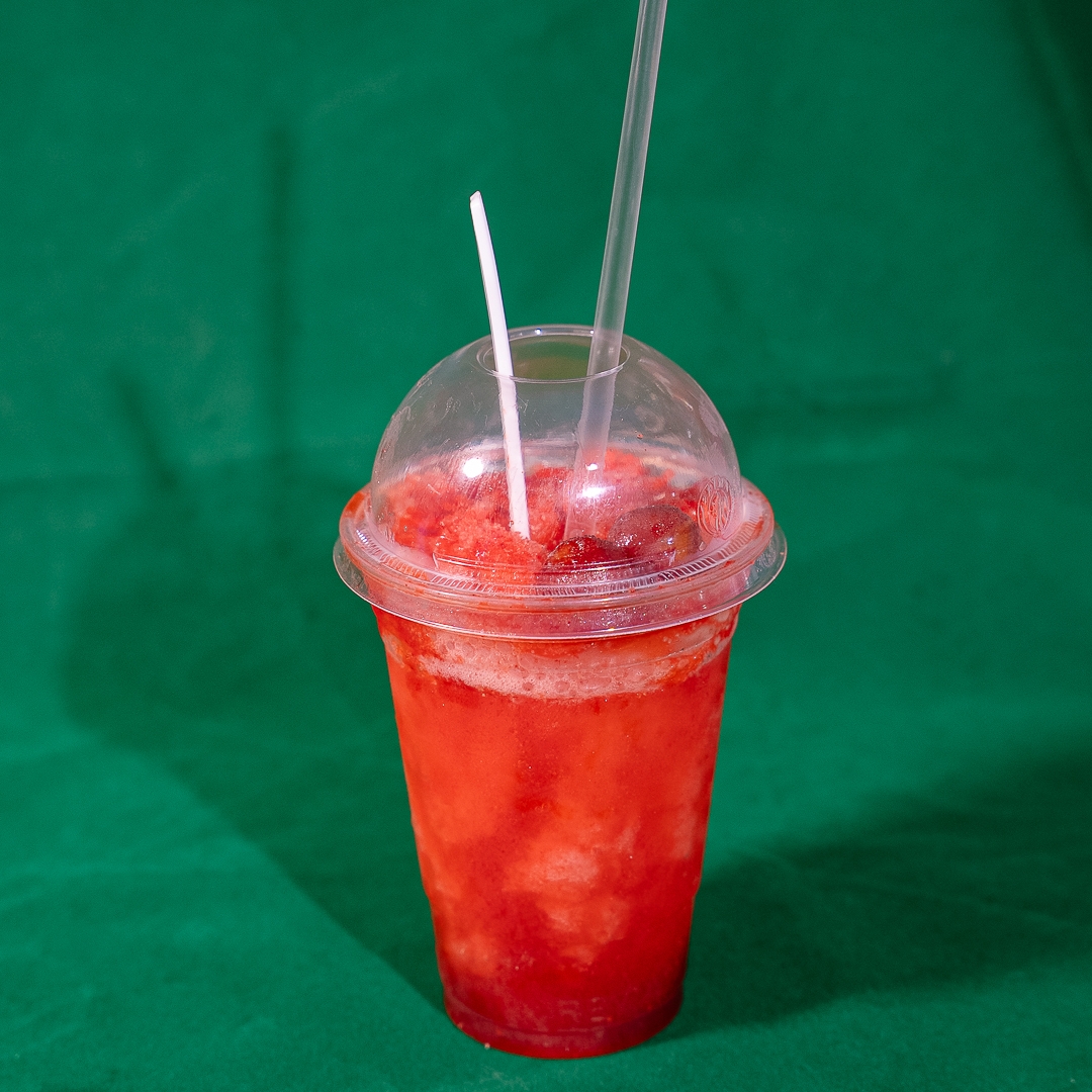 Bebida fría (base agua) de fresa con chamoy, chile en polvo y gomitas.
