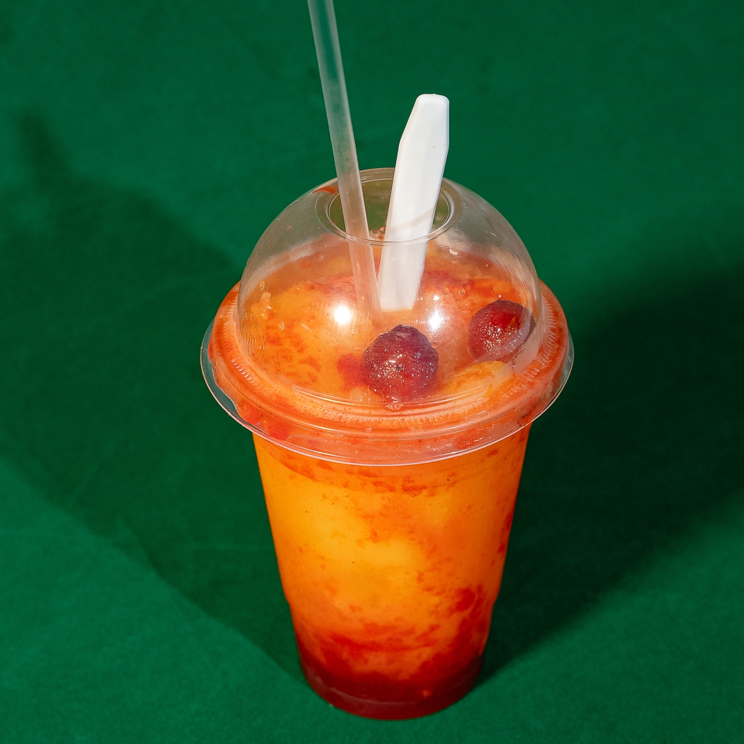 Bebida fría (base agua) de mango con chamoy, chile en polvo y gomitas.