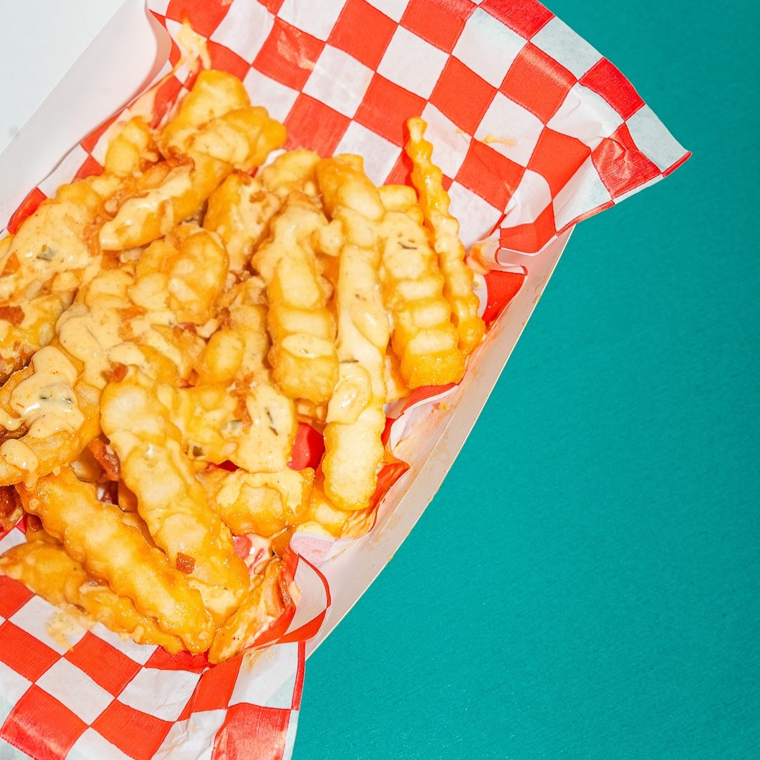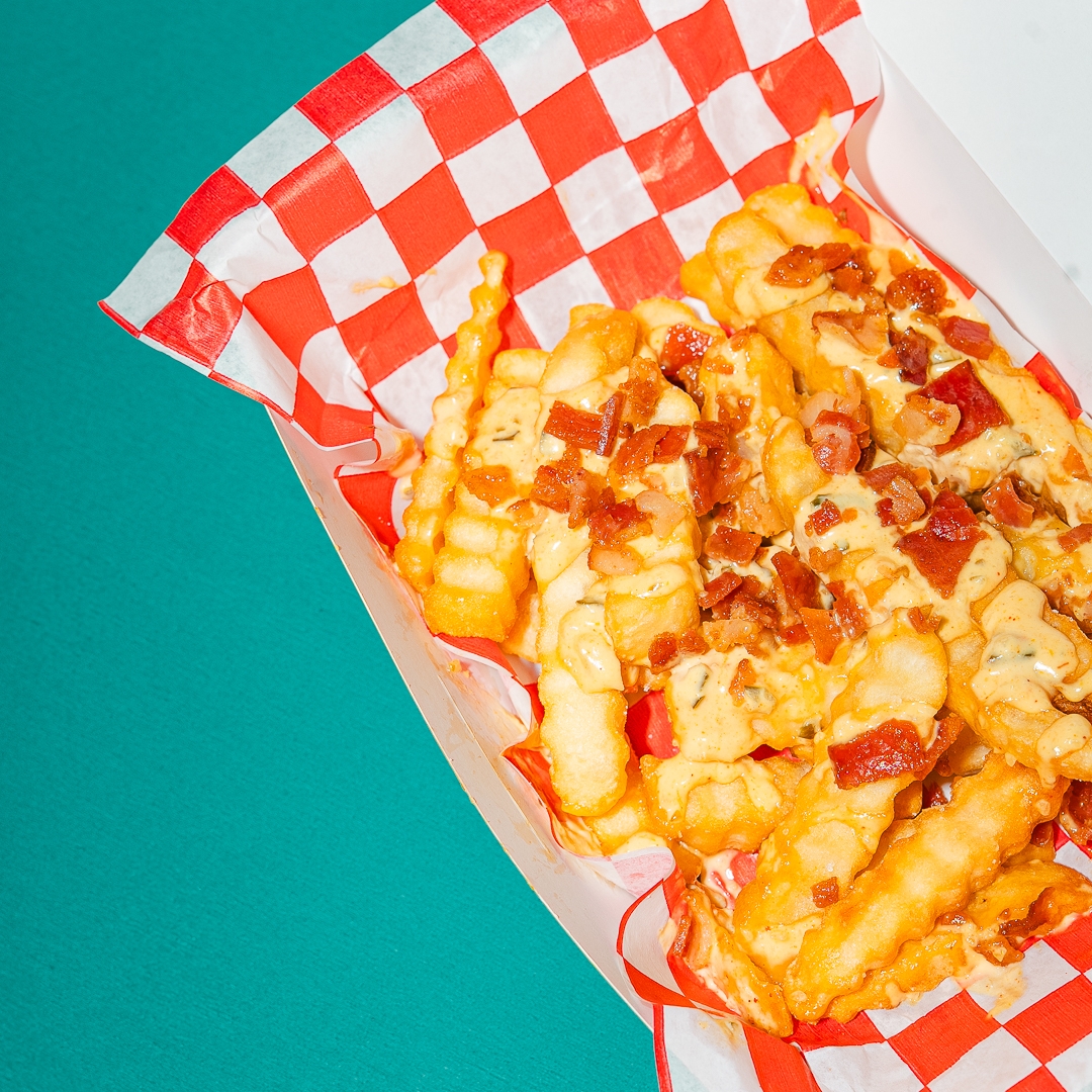 Papas a la francesa con el aderezo especial de la casa y tocino