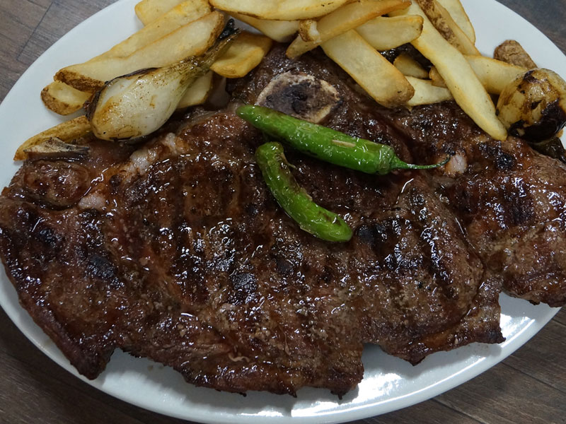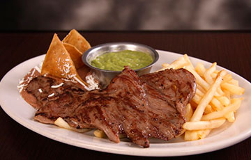 220 g de arrachera, cebolla blanca y pimiento morrón. Guarnición: papas y guacamole