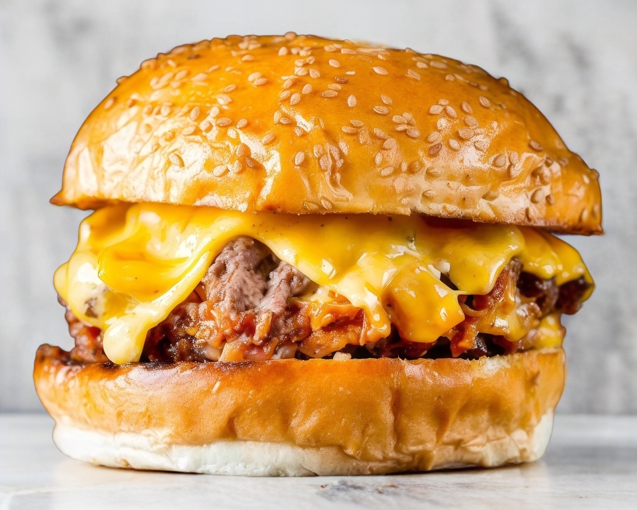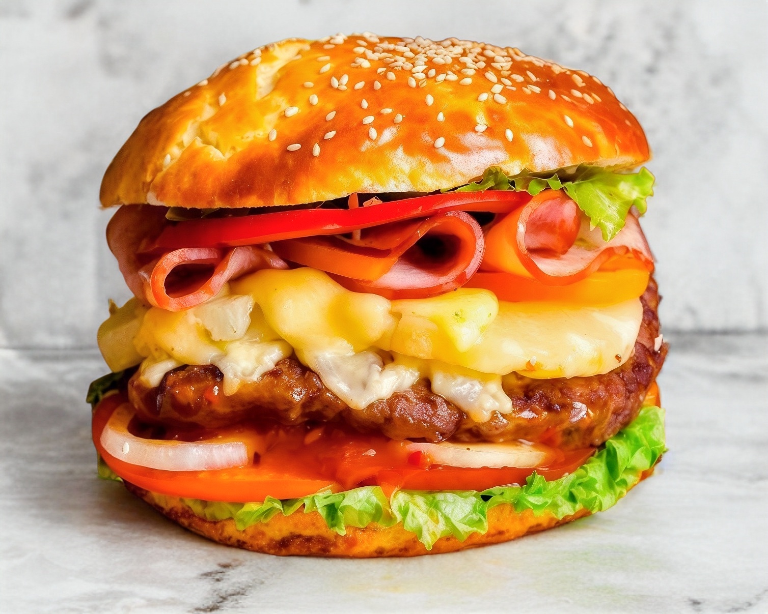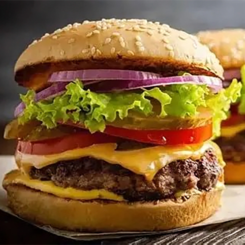 Carne de res, 2 queso amarillo, tomate, lechuga, catsup, mayonesa, mostaza y chile