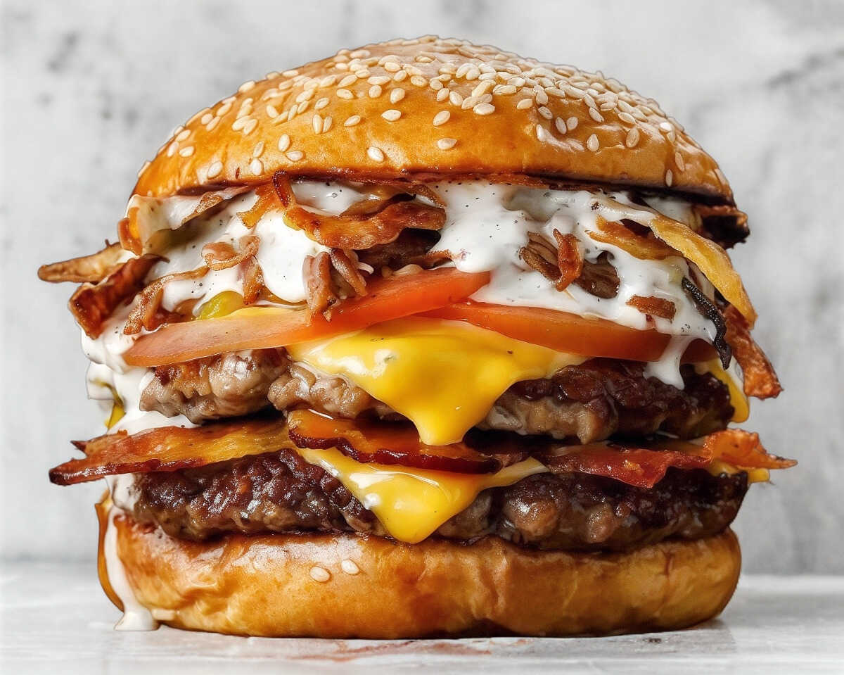 2 Carnes de res, queso manchego, queso amarillo, tomate, lechuga, catsup, mayonesa, mostaza y chile