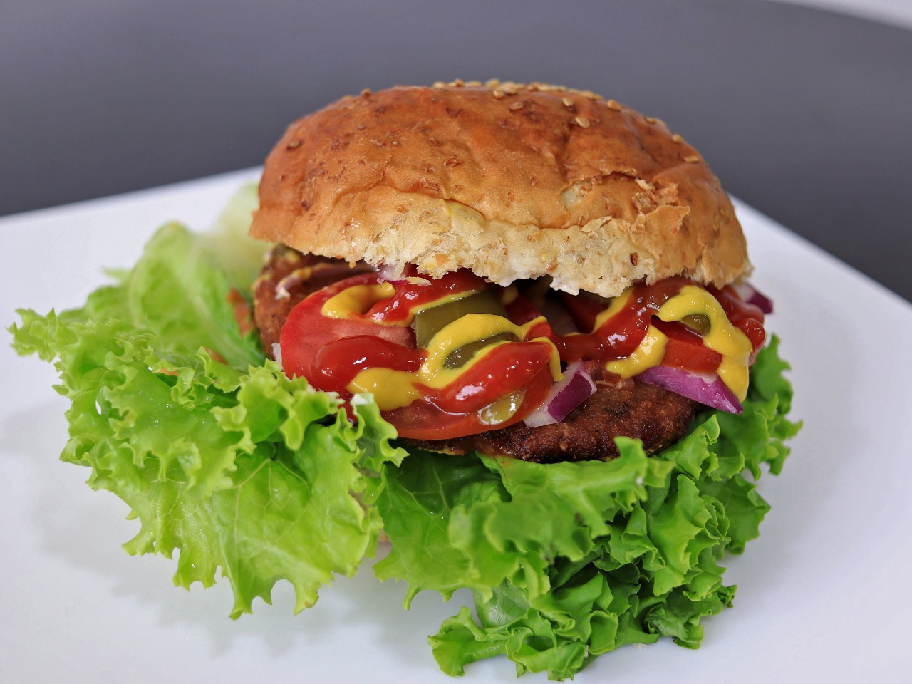 Hamburguesa con carne de soya o amaranto, cátsup, mostaza, mayonesa, chiles en vinagre, lechuga, tomate y cebolla.