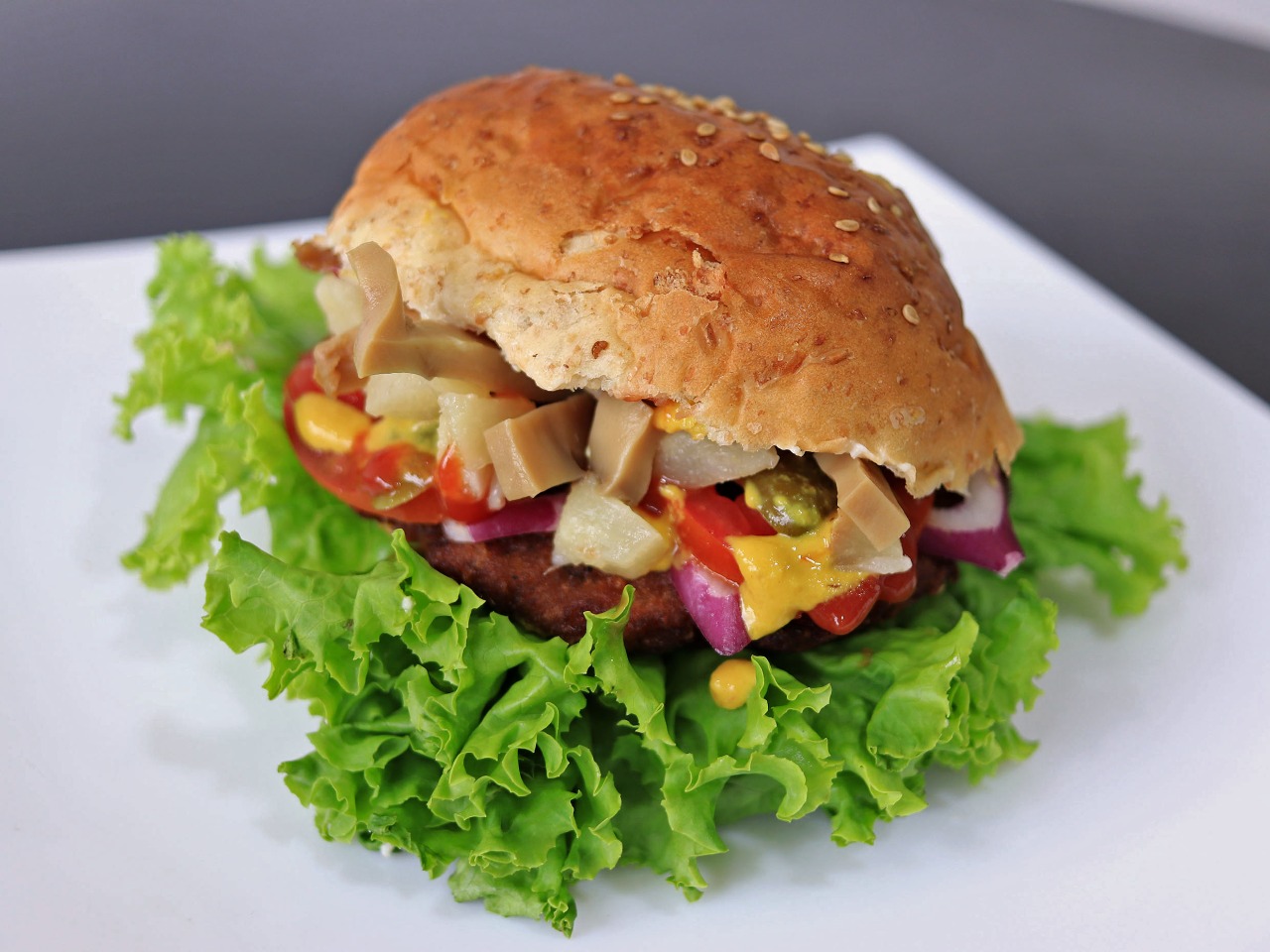 Hamburguesa con carne de soya o amaranto, cátsup, mostaza, hummus de chipotle, chiles en vinagre, lechuga, tomate, champiñones, cebolla.