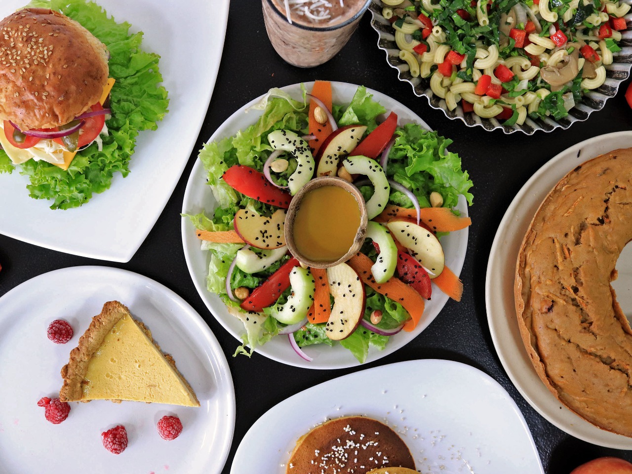 Hamburguesa con carne de soya o amaranto, cátsup, mostaza, mayonesa, chiles en vinagre, lechuga, tomate, cebolla, piña, champiñones, queso amarillo y quesillo.