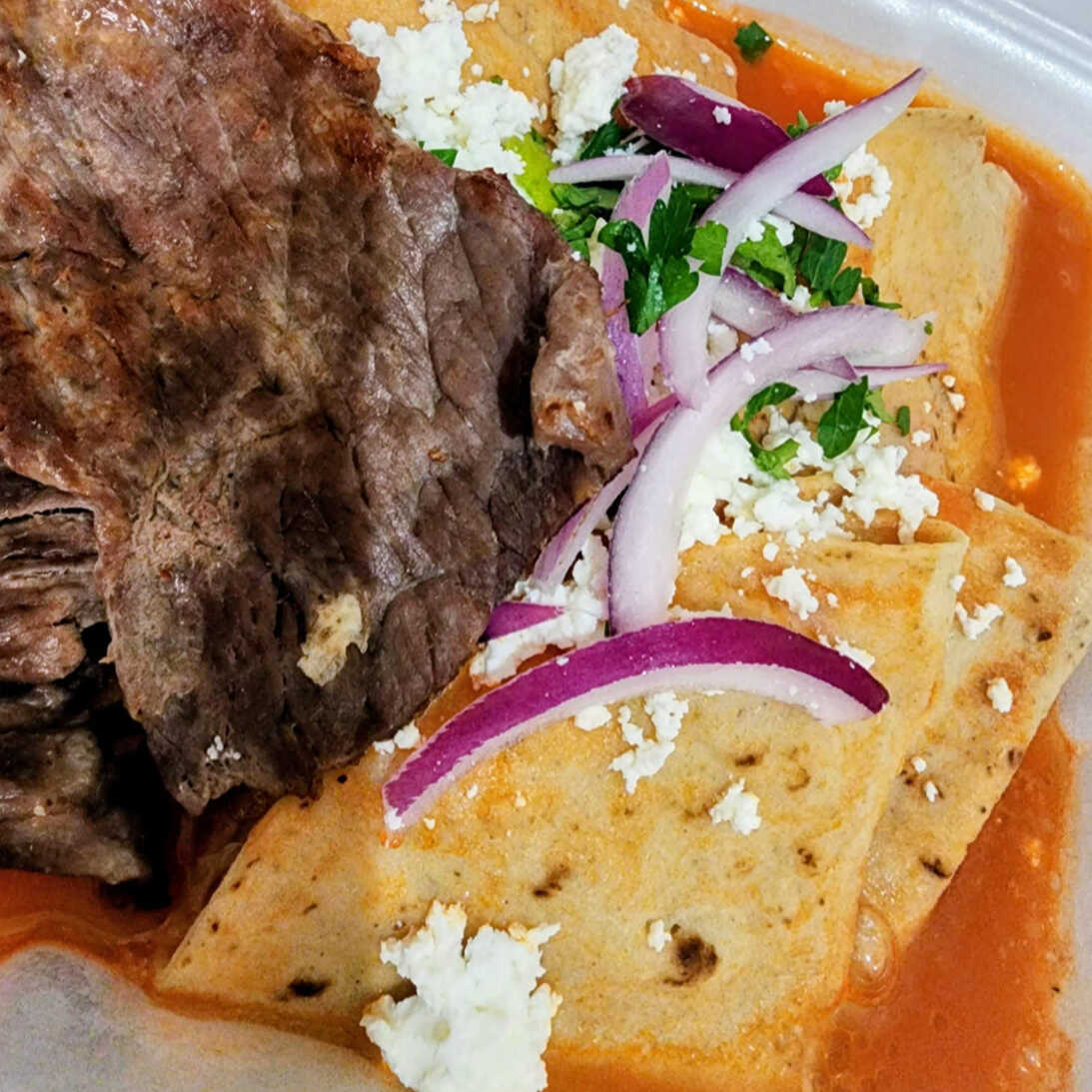 Totopos bañados en salsa roja a base de chile guajillo, acompañadas de queso, perejil, cebolla y crema, 1 bolillo.