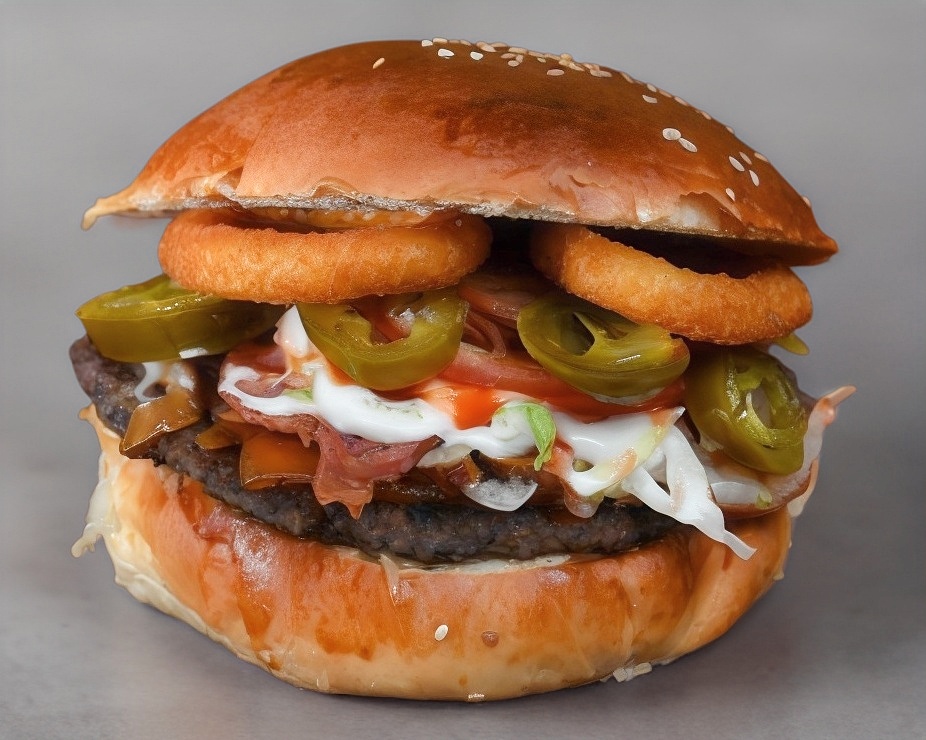Queso manchego, costilla BBQ, tocino, aros de cebolla y cebolla enchipotlada, todas nuestras hamburguesas se preparan con pan artesanal, 100 g de carne molida de res, lechuga, tomate, picante, cátsup y mayonesa.