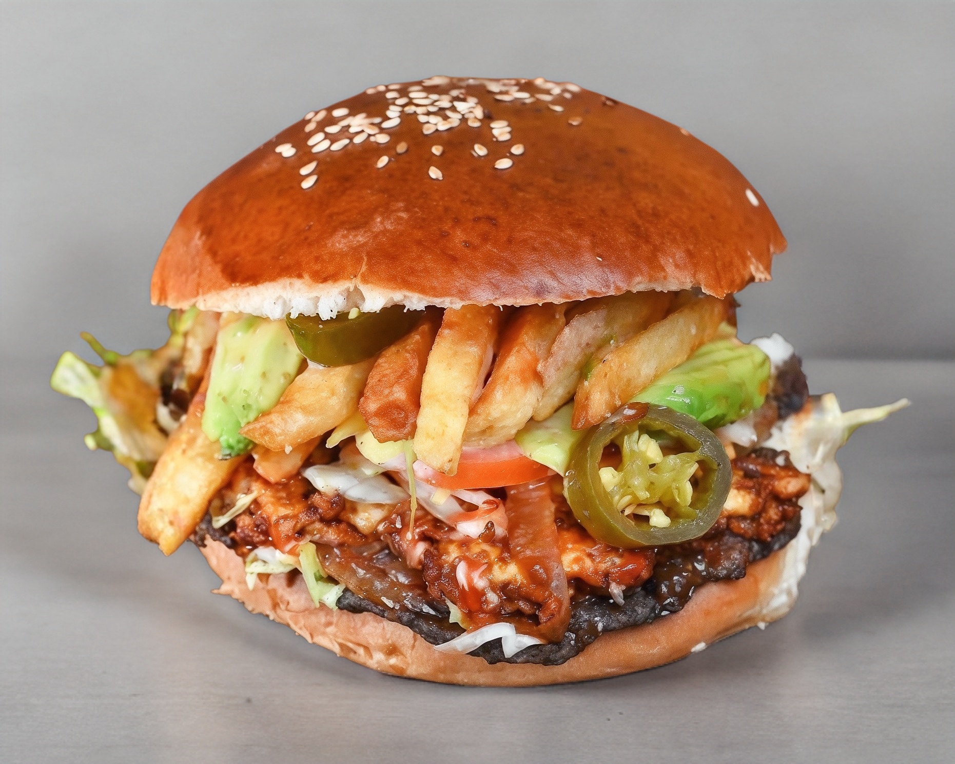Queso manchego, choriqueso, papas fritas, aguacate y cebolla enchipotlada, todas nuestras hamburguesas se preparan con pan artesanal, 100 g de carne molida de res, lechuga, tomate, picante, cátsup y mayonesa.