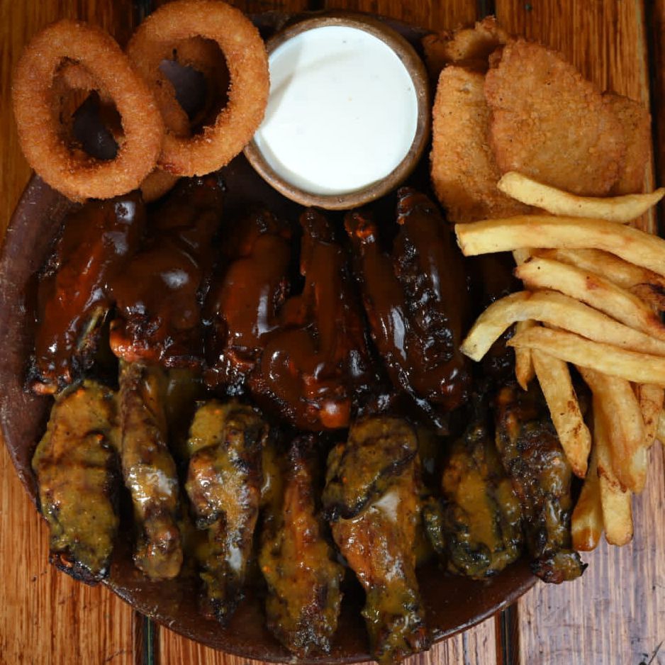 14 Alitas con 2 salsas a elegir, 4 nuggets, 4 aros Cebolla y acompañados de 2 aderezo ranch.
