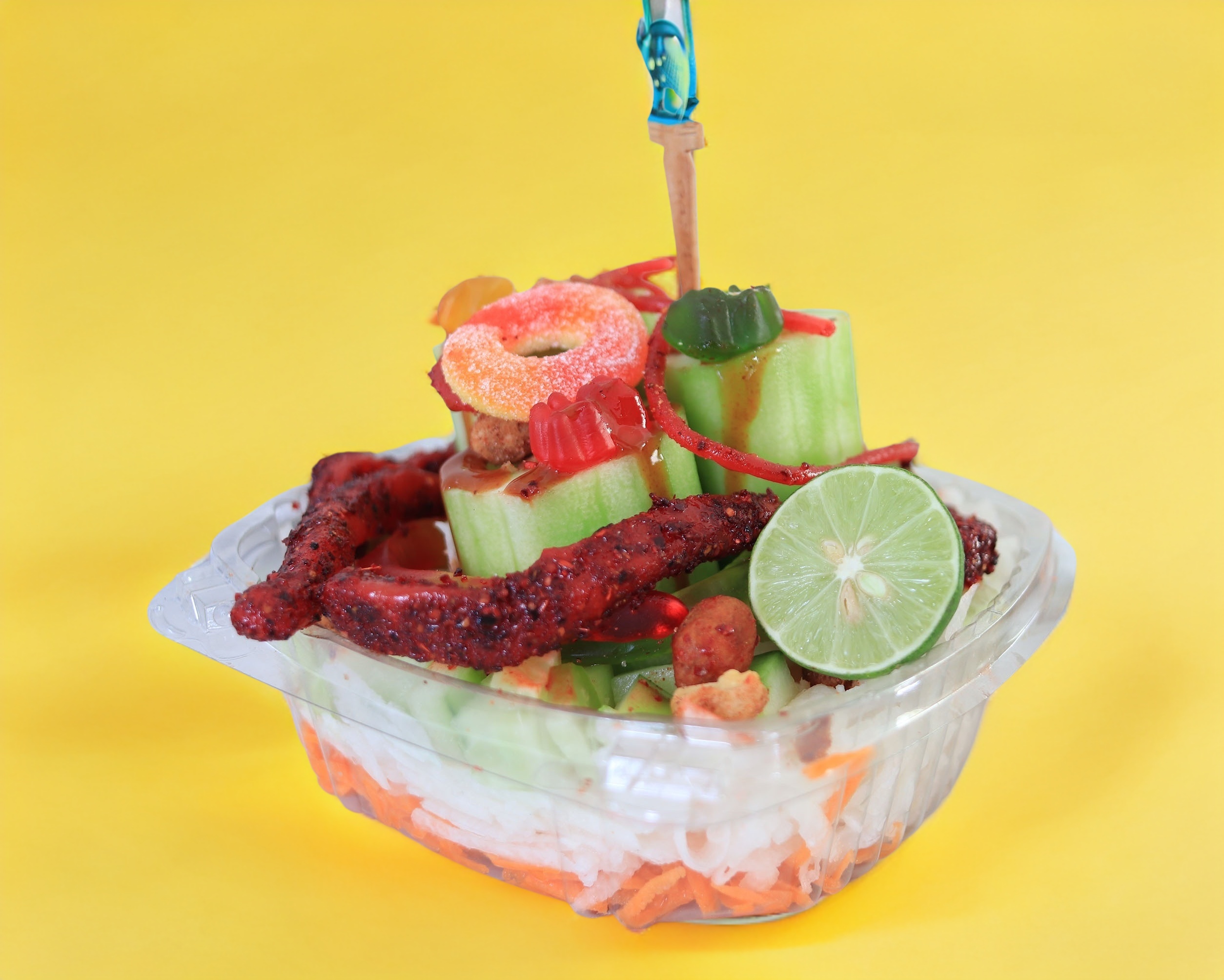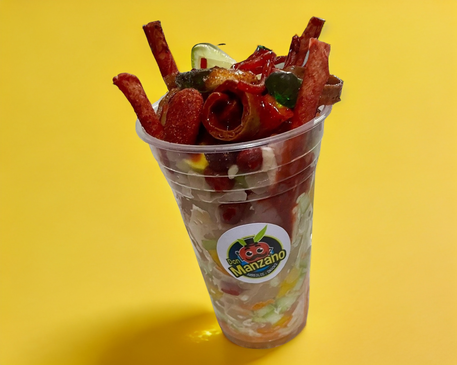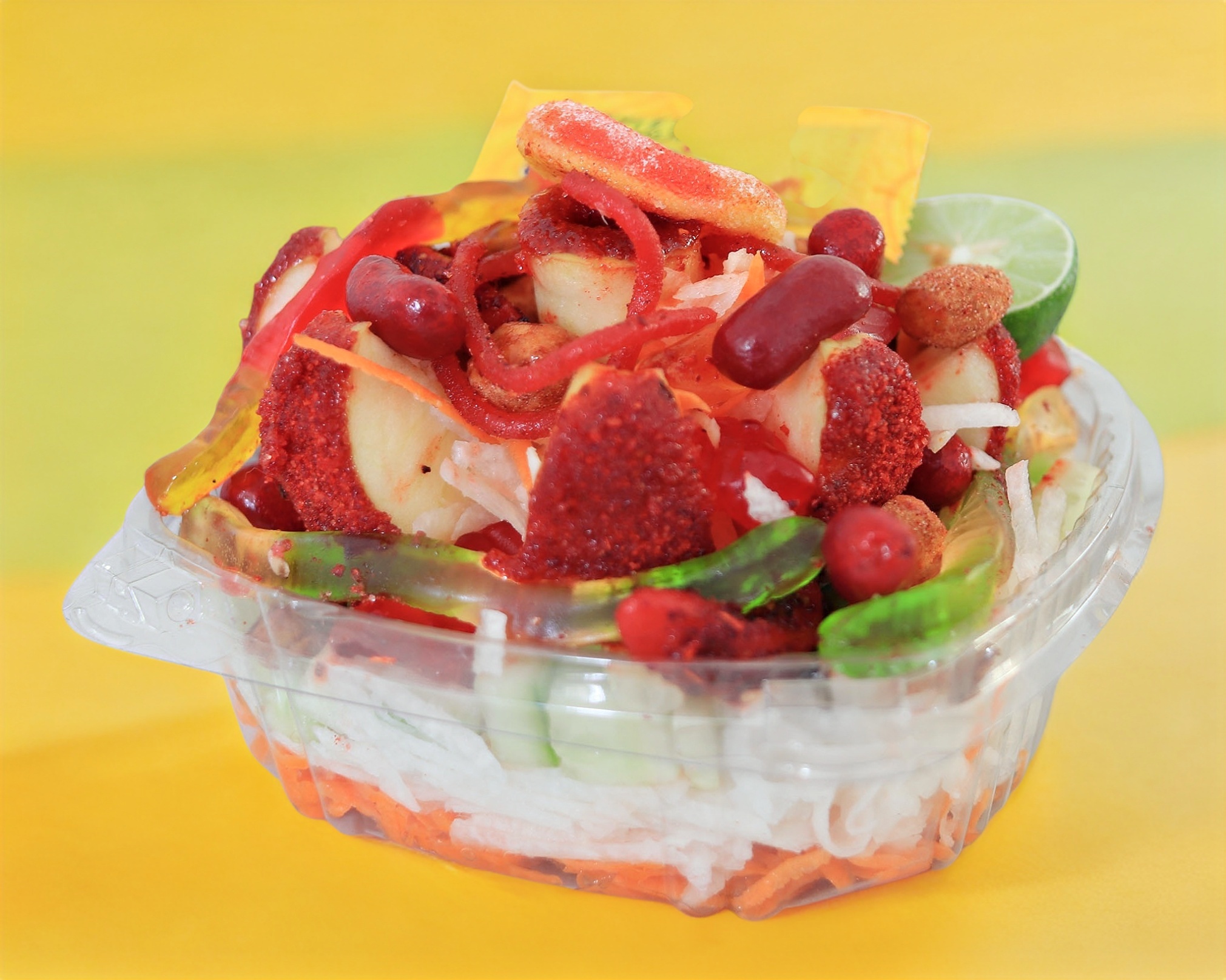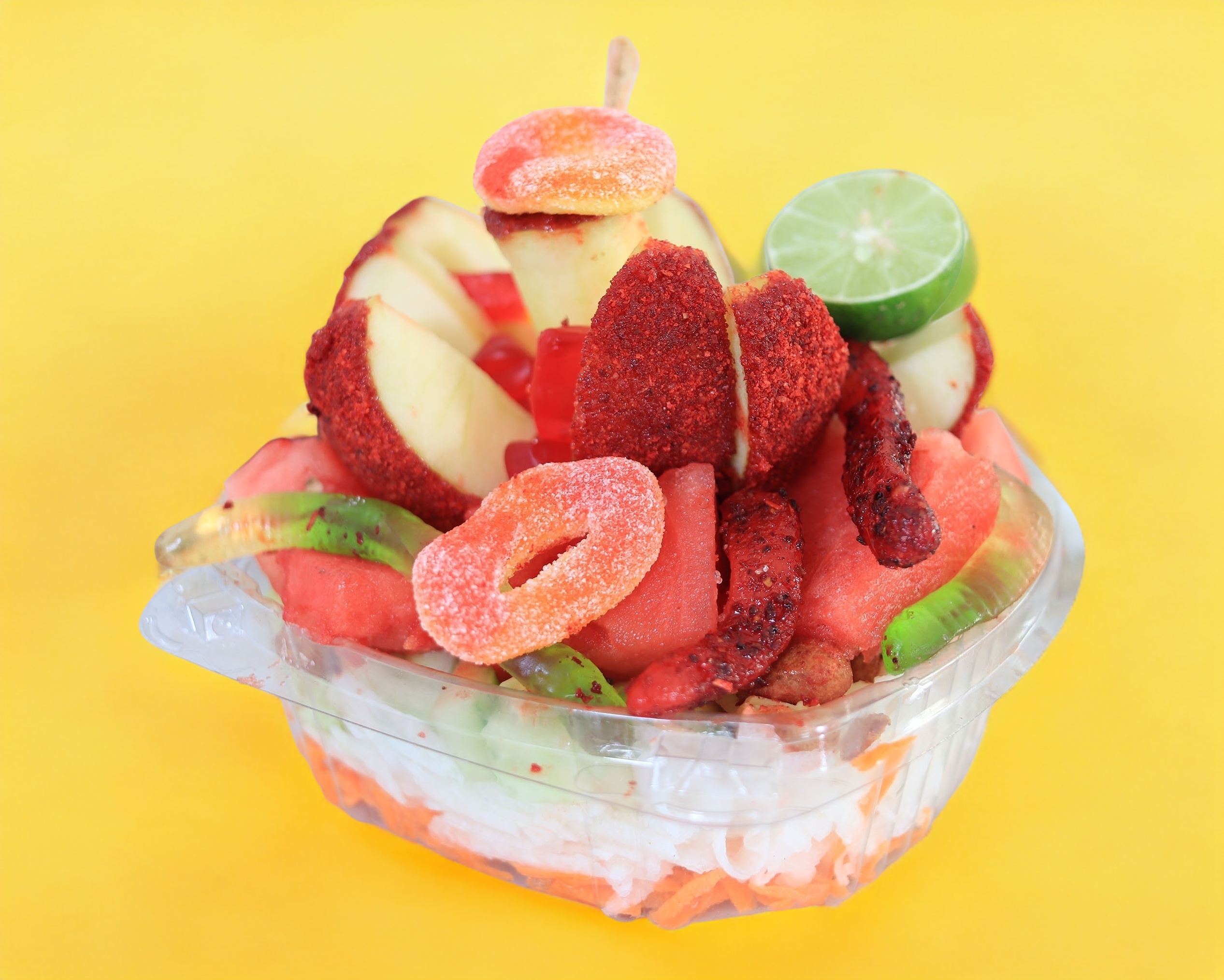 Fruta de la temporada y tropicales,verdura jícama y pepino , topping de gomitas dulces y enchiladas y manzana a elegir cualquier especialidad.