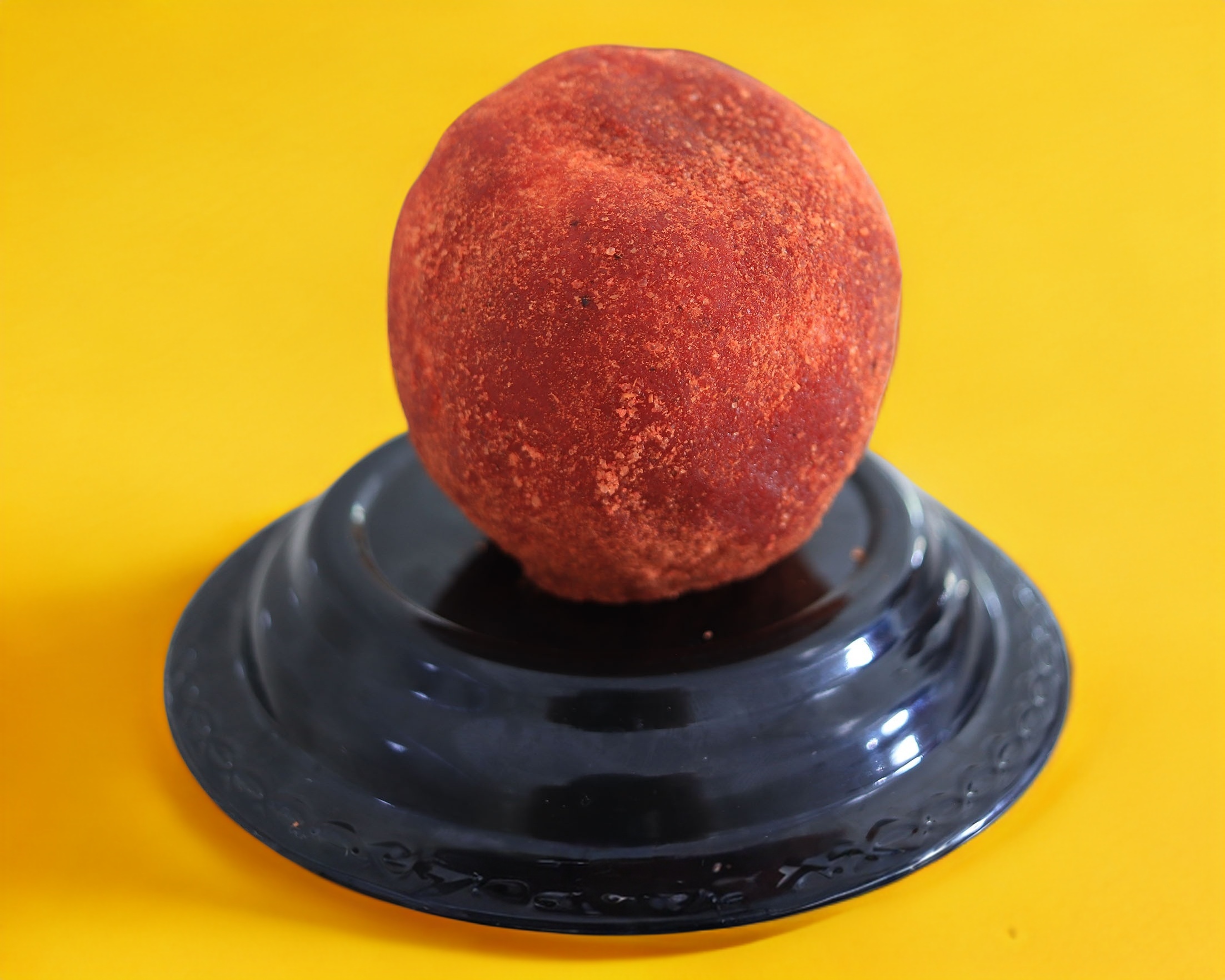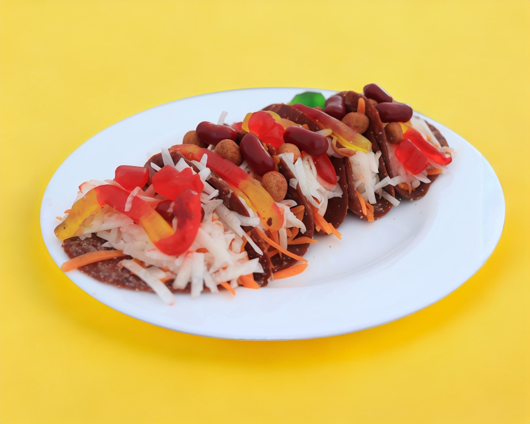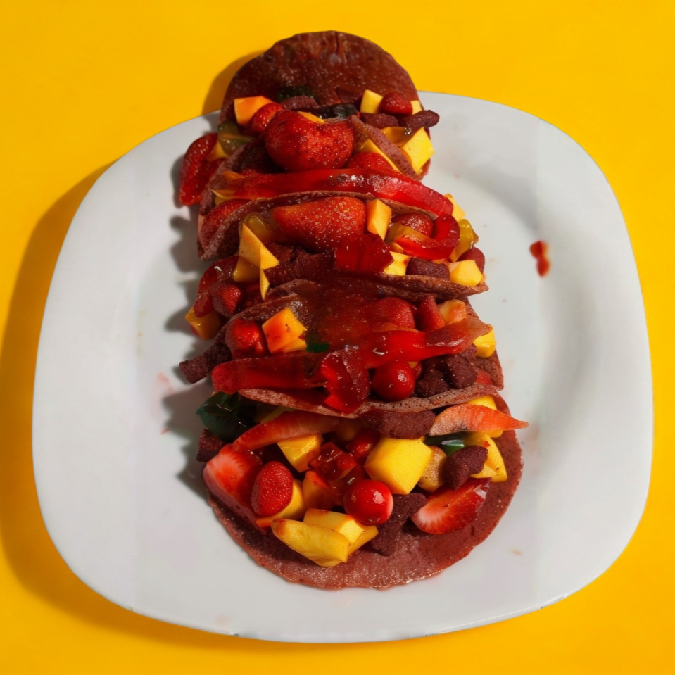Torrilla de tamarindo con fruta rayada y toppings de gomitas y cacahuetes