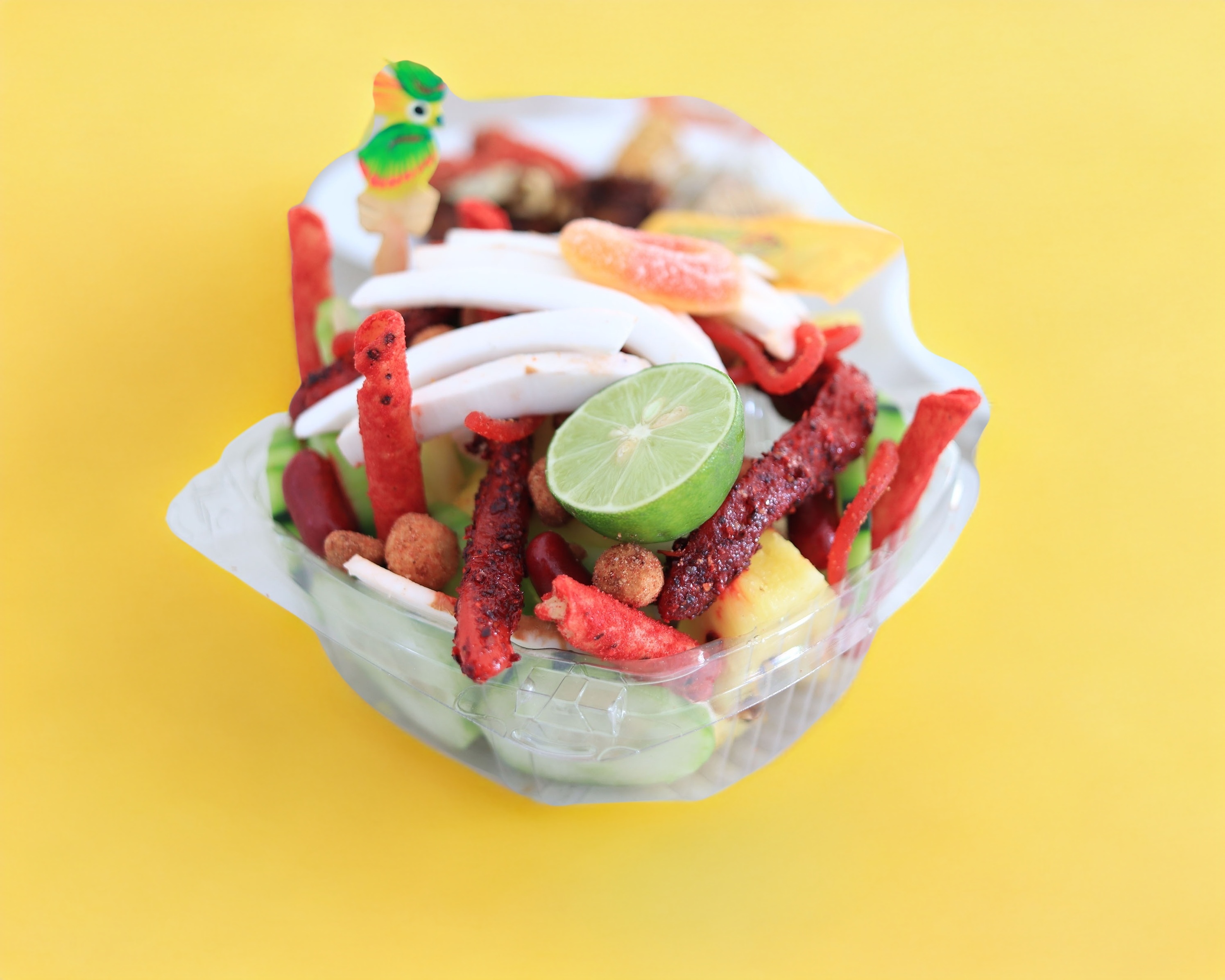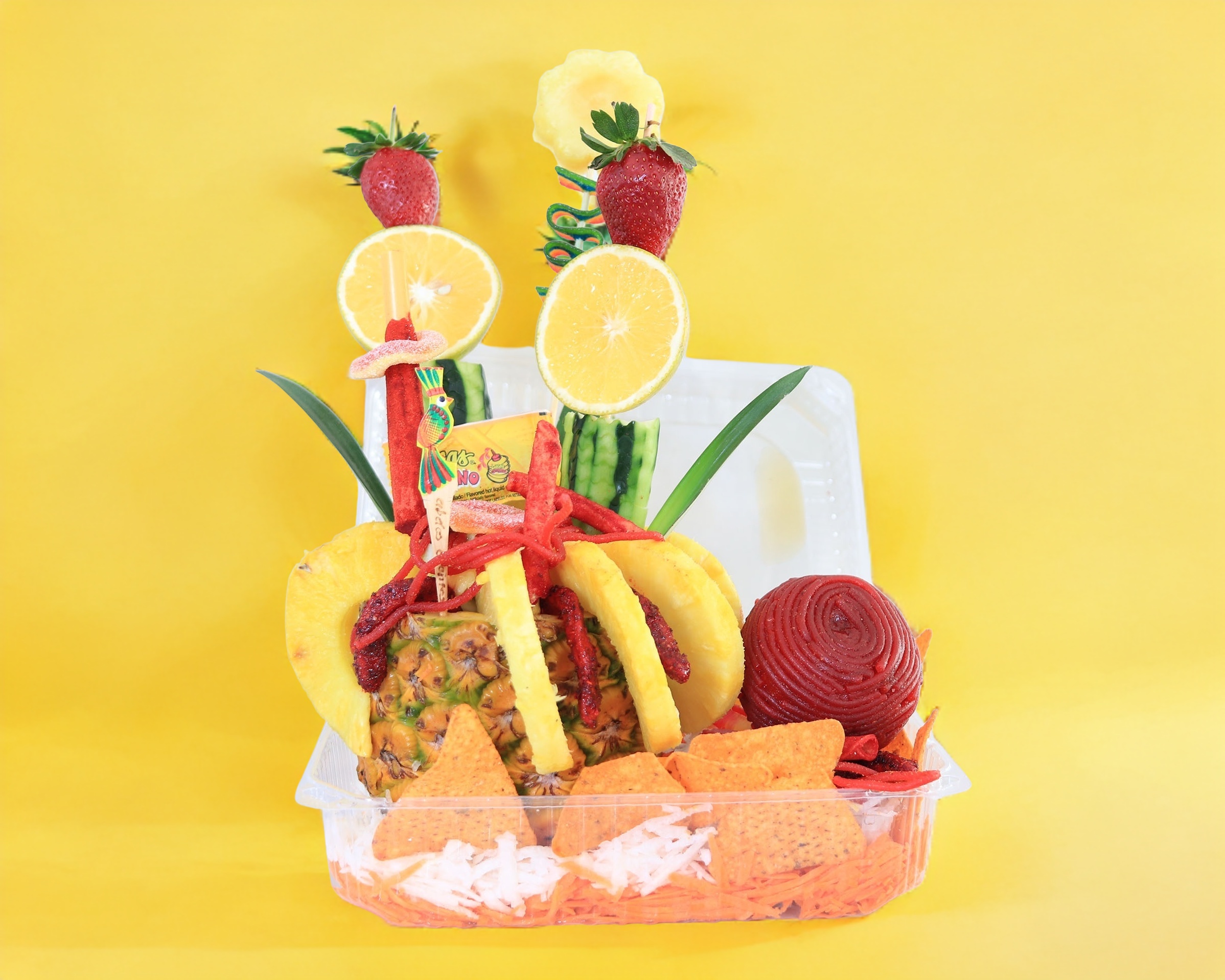 Diferentes frutas tropicales y de temporada, topping de gomitas dulces y enchiladas y botana a elegir.
