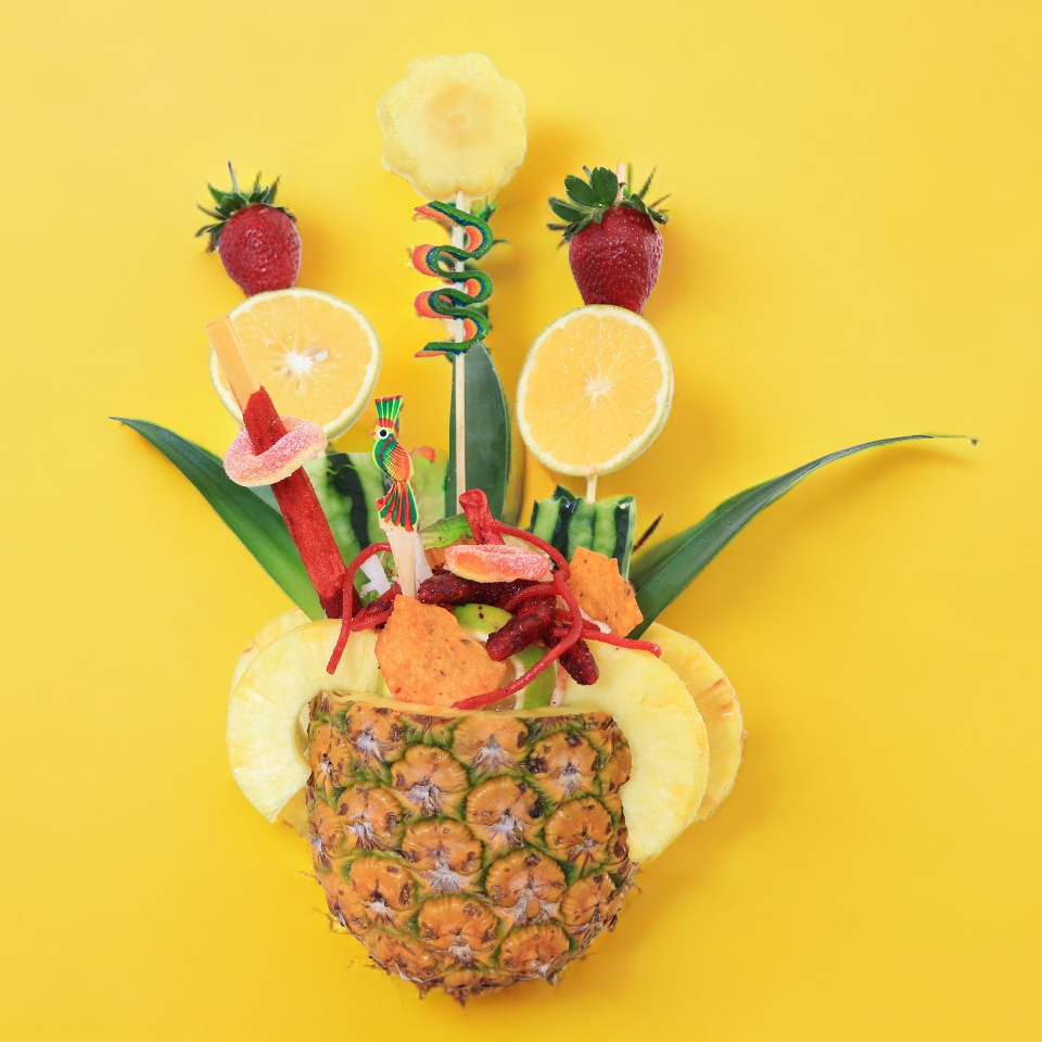 Piña botanera en domo, acompañada de rica fruta de temporada,y verduras jicama y zanahoria , topping botanero de gomitas dulces y enchiladas, manzana de cualquier especialidad, brochetas frutales y 1 bastón de tamarindo.