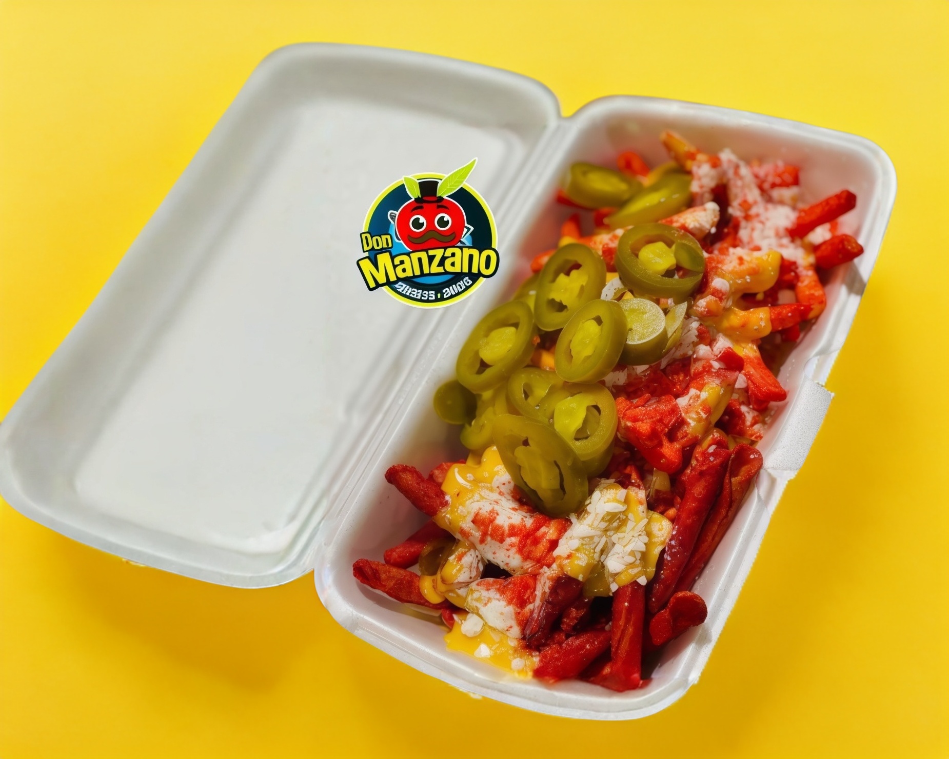 55 gr. de takis fuego con queso amarillo tipo americano, jalapeños y queso ranchero.